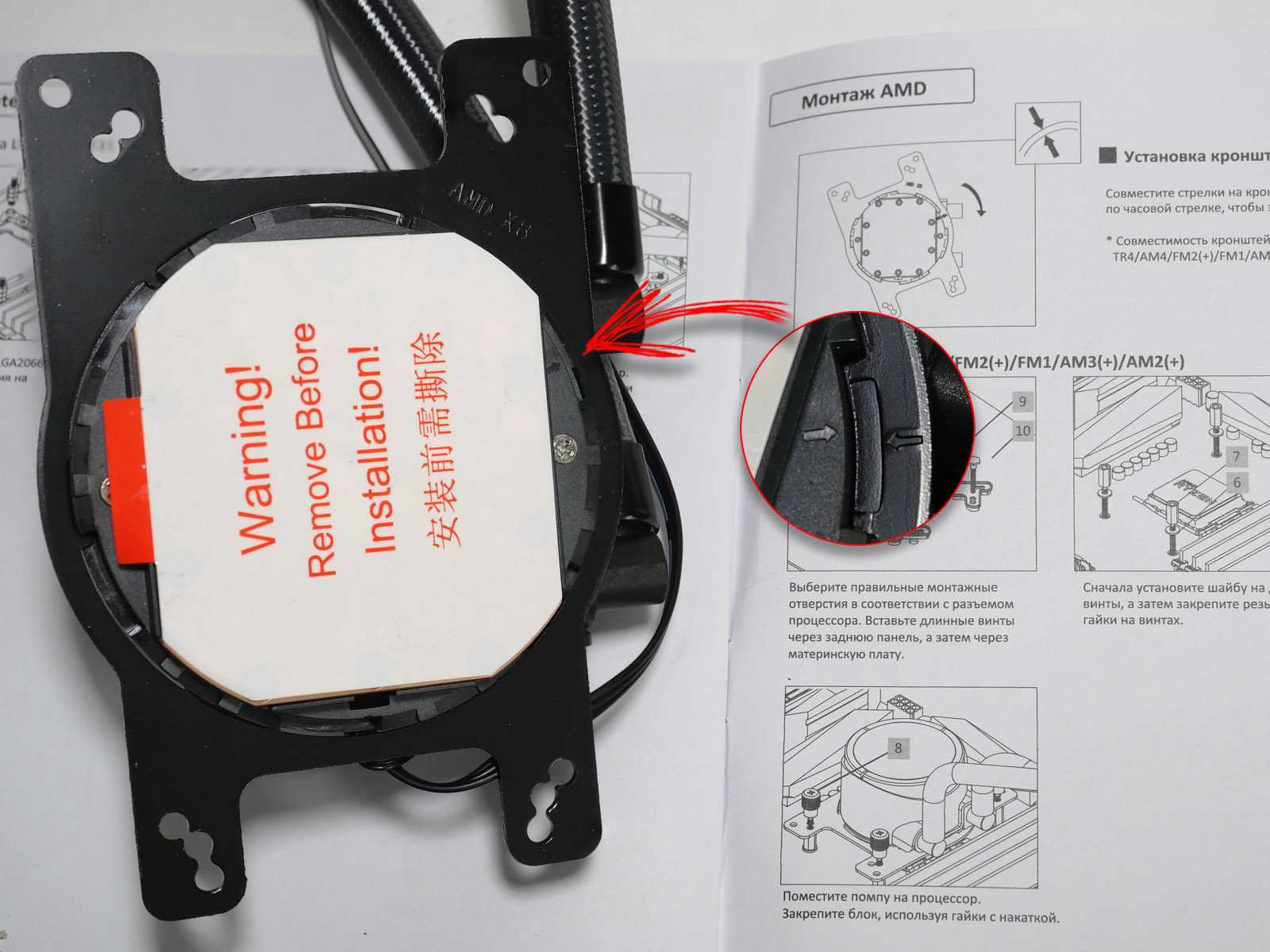 Первым шагом на водоблок необходимо установить универсальную рамку для сокетов от AMD. Для этого она насаживается на специальные пластиковые защёлки по окружности основания и фиксируется поворотом до небольшого щелчка. Правильная позиция до поворота указана на корпусе водоблока и пластине маленькими стрелками. После чего можно удалить белую наклейку, защищающую медную пластину от царапин.