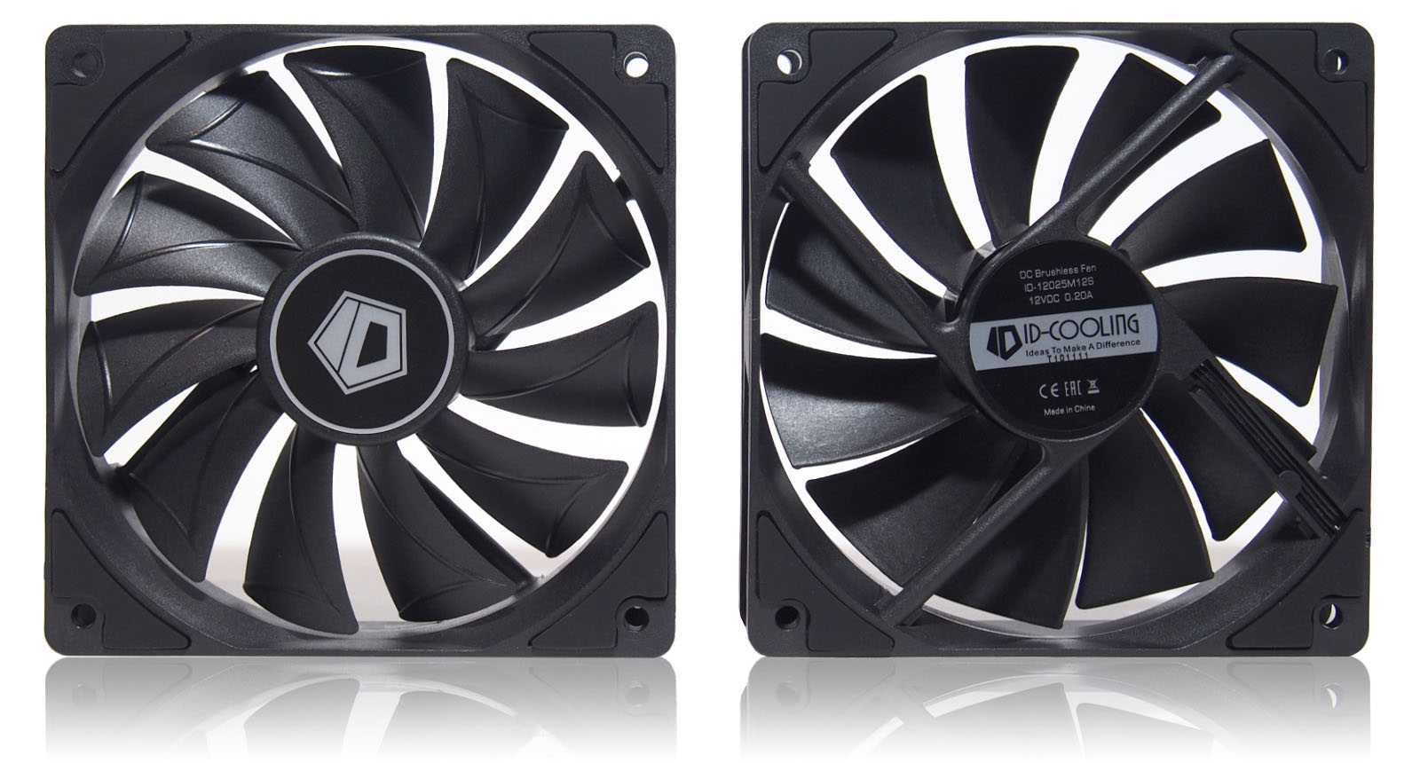 В комплекте с СЖО вложены два одиннадцатилопастных 120-мм вентилятора ID-Cooling ID-12025M12S с номинальным напряжением питания 12 В, потребляемым током до 0,2 А и скоростью, регулируемой от 700 до 1800 оборотов в минуту. По углам каркаса сделаны прорезиненные вставки для гашения вибрации. На крыльчатке отлиты специальные фигурные наплывы для оптимизации воздушного потока.