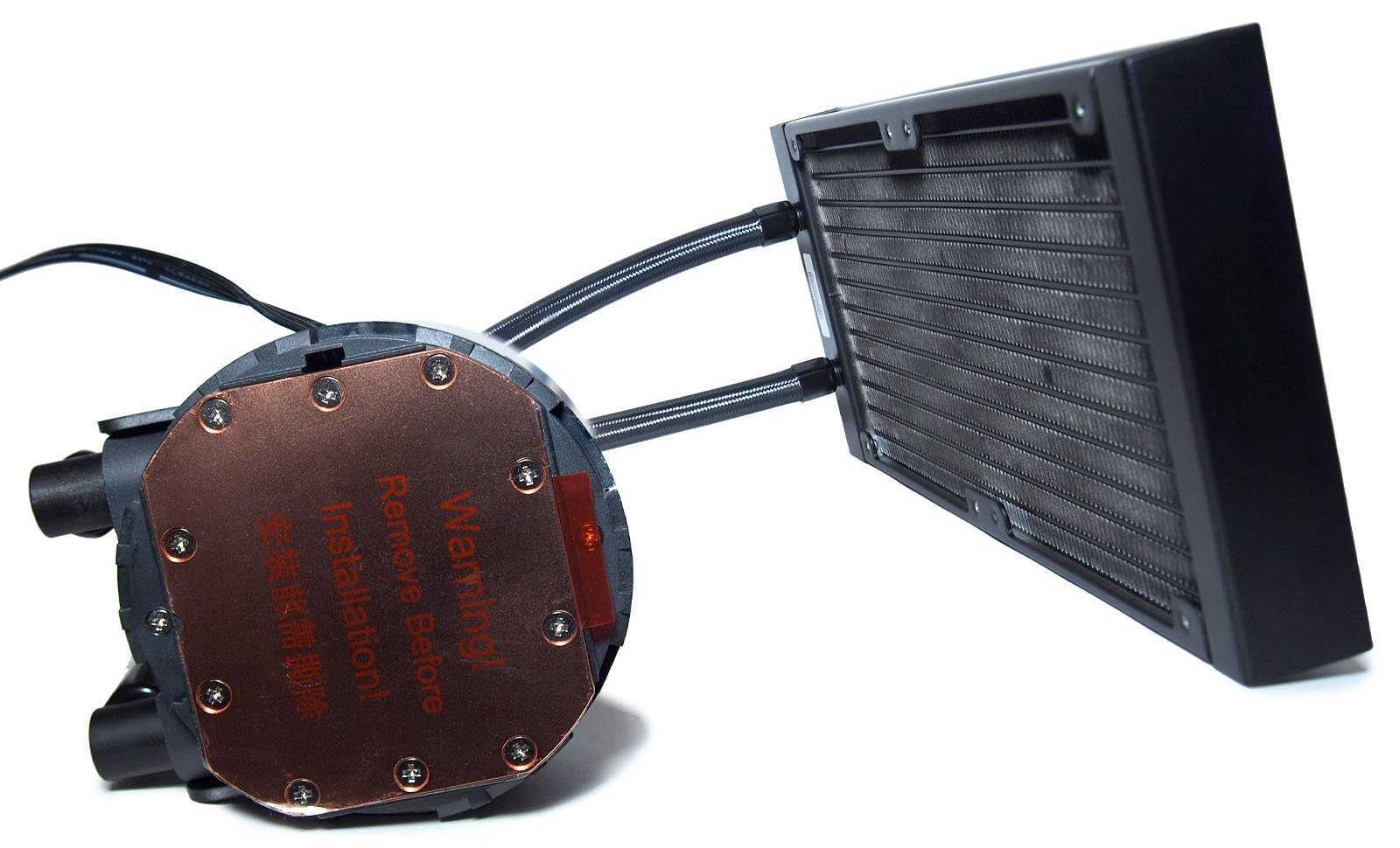 На водоблоке используются поворотные «Г»-образные фитинги, на радиаторе — простые прямые. Соединительные шланги заключены в дополнительную нейлоновую оплётку и имеют длину 40 см, которой будет достаточно для установки в просторных корпусах.