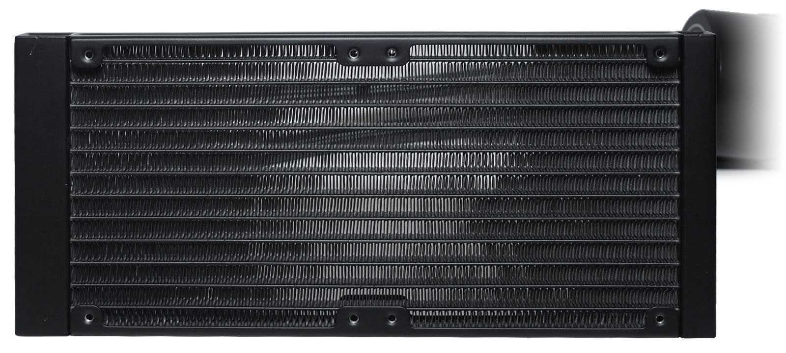 Заливного отверстия нет, контур охлаждения не предусматривает дозаправку или обслуживание пользователем. Отверстия для крепления вентиляторов сделаны с обеих сторон каркаса радиатора. Они размечены точно и имеют хорошую резьбу, с которой надо быть аккуратнее, чтобы не сорвать при затягивании комплектных винтов.