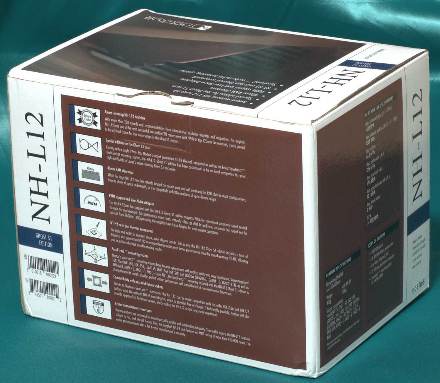 Несмотря на то, что низкопрофильный кулер Noctua NH-L12 Ghost S1 Edition оптимизирован для корпуса Louge Ghost S1, дизайн самой коробки сделан в фирменном стиле компании Noctua с привычной компоновкой информационной части. Единственное, на ней отмечено, что кулер является специальной версией для корпуса Ghost S1, обладающей высотой 66 мм, совместимой с модулями памяти высотой до 48 мм и поставляющейся с новой термопастой Noctua NT-H2. На коробке также присутствуют технические характеристики с полными размерами кулера.