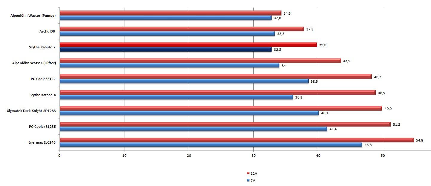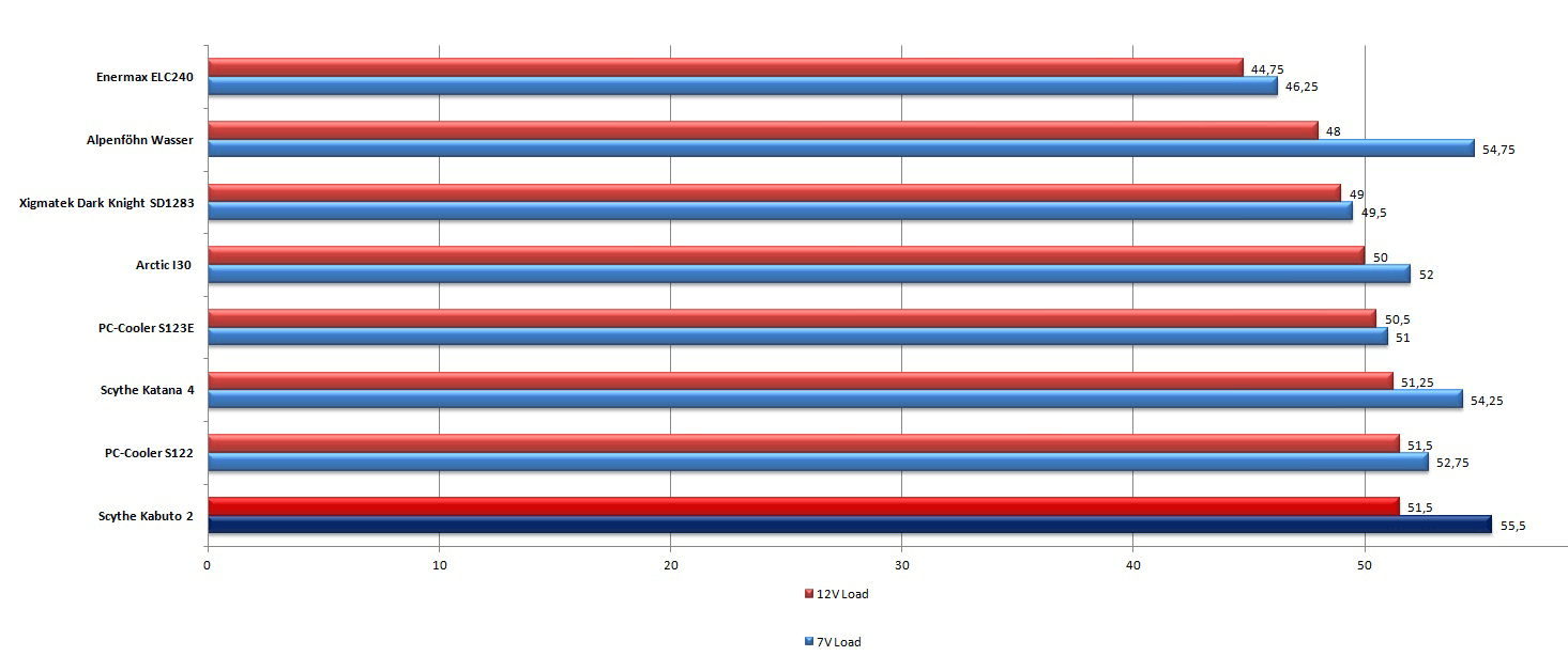 На 12V кулер становится вторым после ARCTIC i30 по тишине работе, а на 7V занимает почётное первое место.
