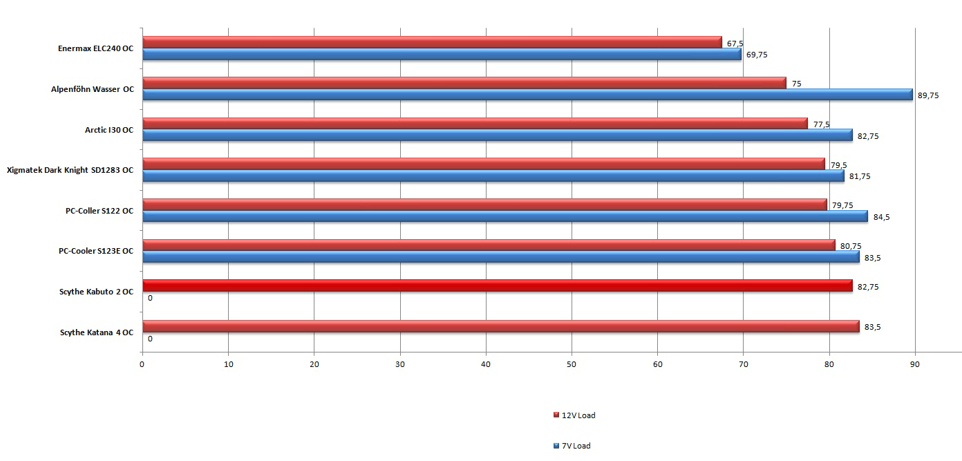 Дела у продукта Scythe идут не очень хорошо — если вентилятор на 12V ещё справляется с делом охлаждения процессора, то на 7V температура «камушка» быстро дошла до 95 градусов по Цельсию и тест был остановлен.