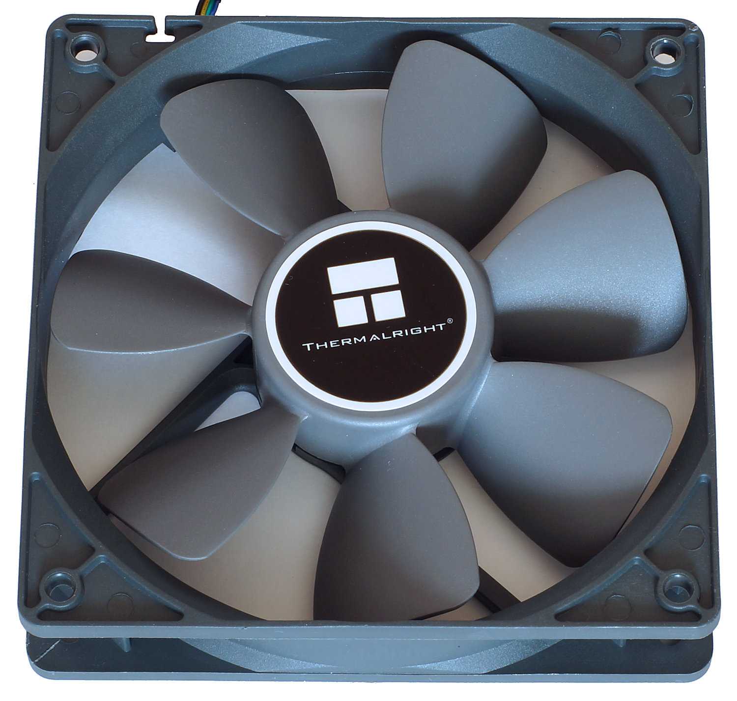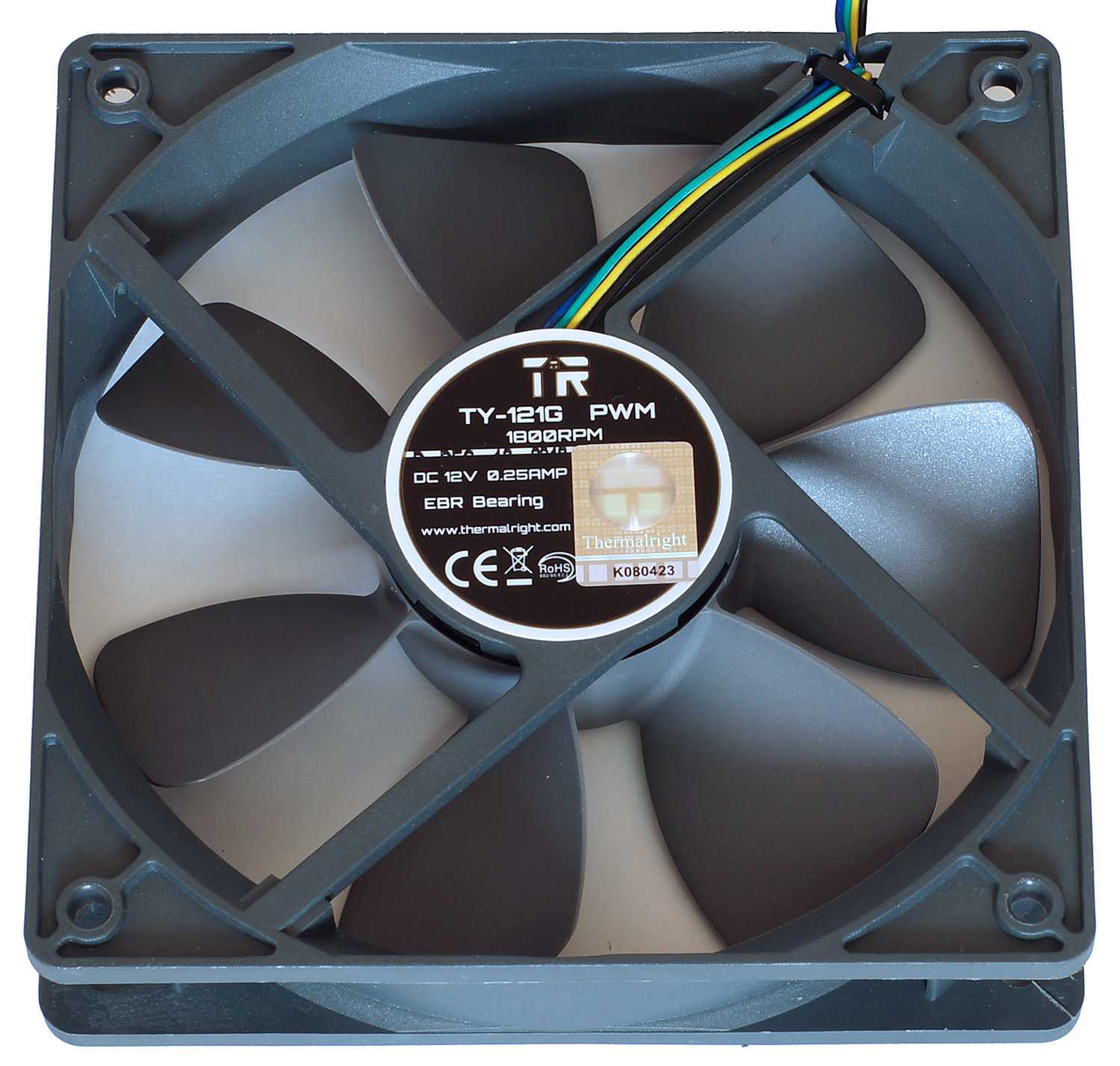 Кулер поставляется с производительным 120 мм вентилятором Thermalright TY-121G, имеющим максимальные обороты 1800 rpm и обеспечивающим, согласно производителю, уровень шума 25 дБ. Но по факту он все-таки шумнее.
