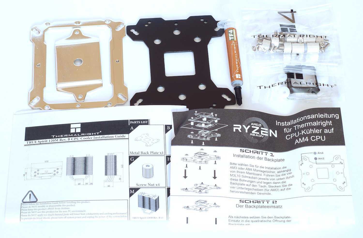 Комплектация практически дублирует серию Macho: инструкция по установке, универсальный бекплейт и рамка крепления, прижимная пластина. Не хватает разве отвертки и набора скоб, но это связано с особенностями установки вентилятора.