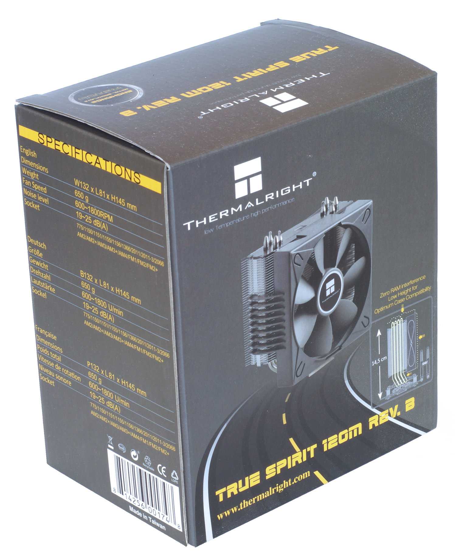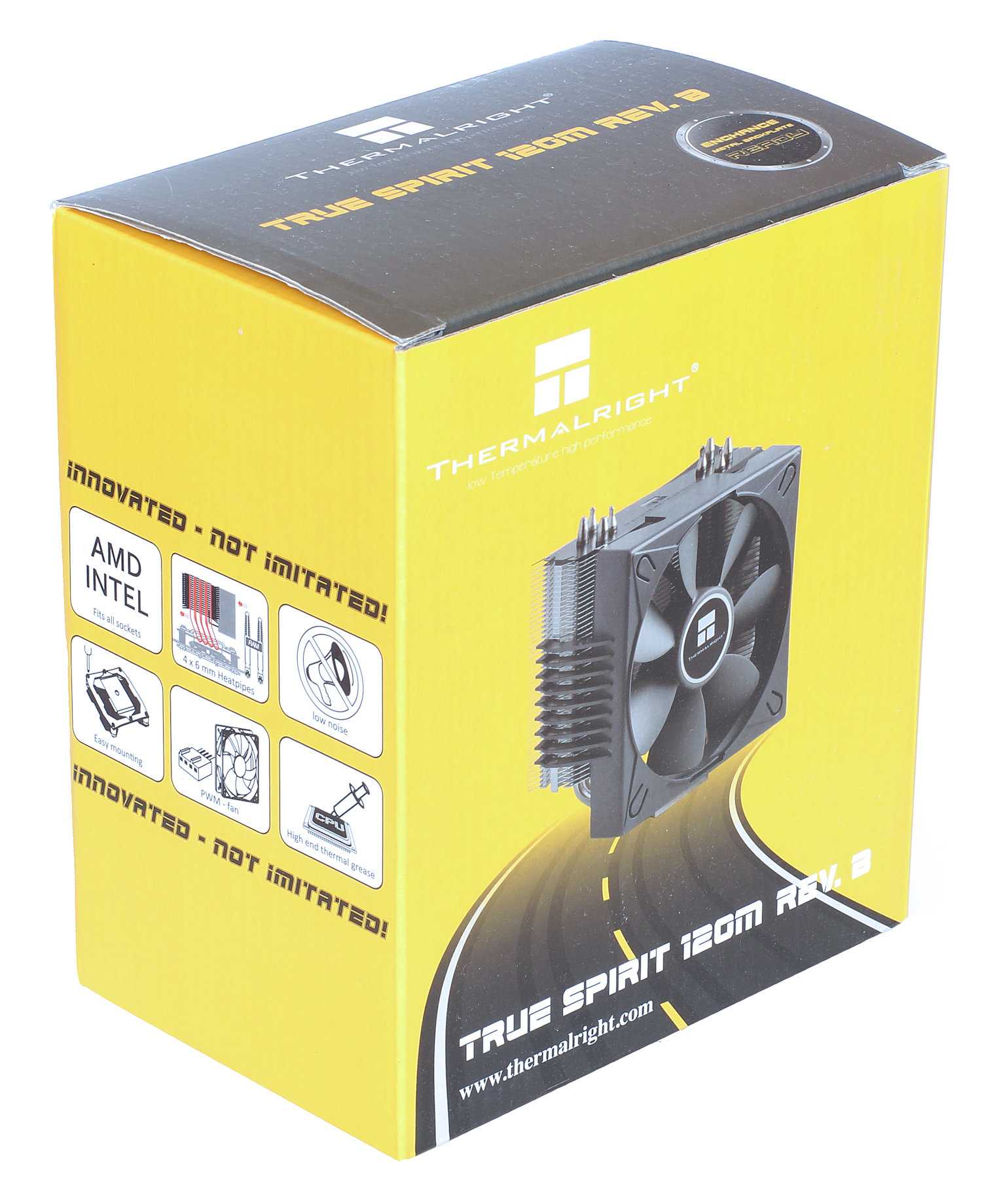 Поставляется кулер Thermalright True Spirit 120M Rev. B в небольшой желто-черной коробке, где присутствует изображение кулераи размещена минимальная информационная часть. На ней приведены краткие технические характеристики на нескольких языках и подчеркнуты особенности конструкции: совместимость со всеми сокетами (исключение AMD TR4), применение четырех 6 мм медных тепловых трубок, асимметричный дизайн, необходимый для того, чтобы обеспечить установку высоких модулей памяти.