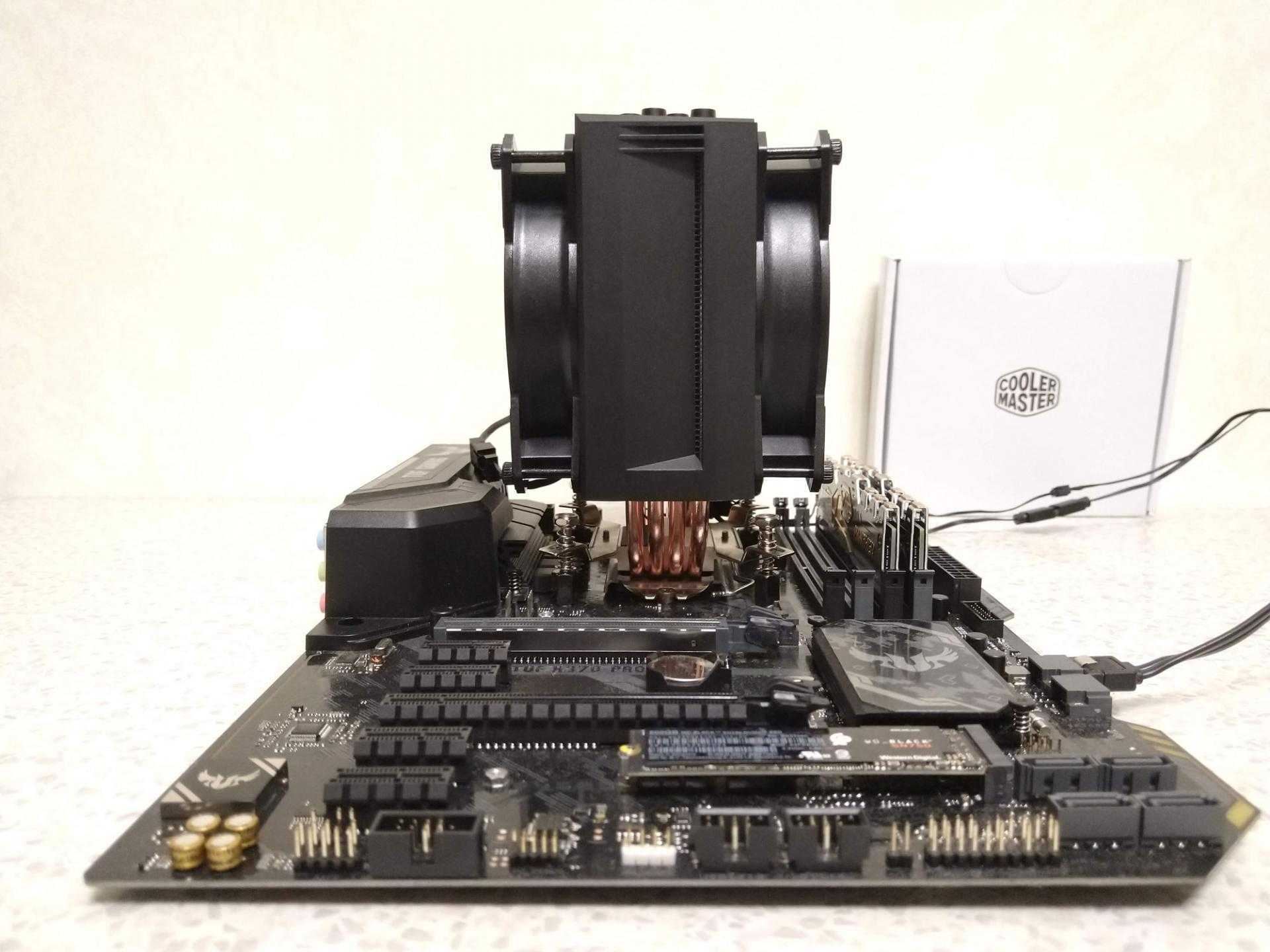 У сегодняшней модели Cooler Master MasterAir MA410M два 120-мм вентилятора, один из которых работает на забор воздуха, второй на выдув.