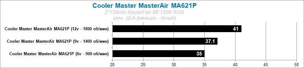 Процессорный охладитель MasterAir MA621P можно назвать тихим лишь на низких и средних скоростях вращения его вентиляторов. На максимальной скорости комплектные вертушки уже становятся шумными, что снижает комфорт при работе за таким ПК.