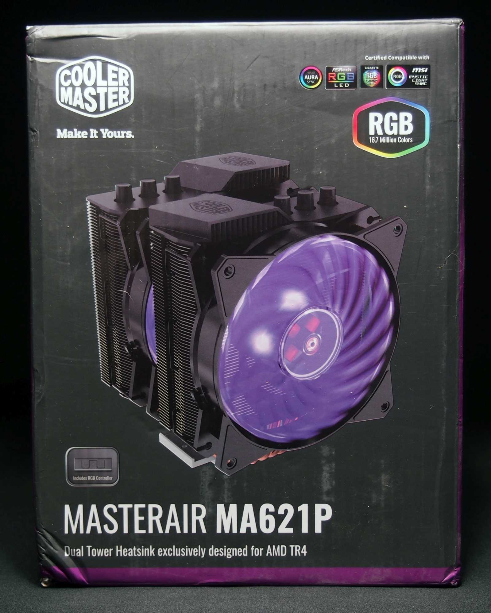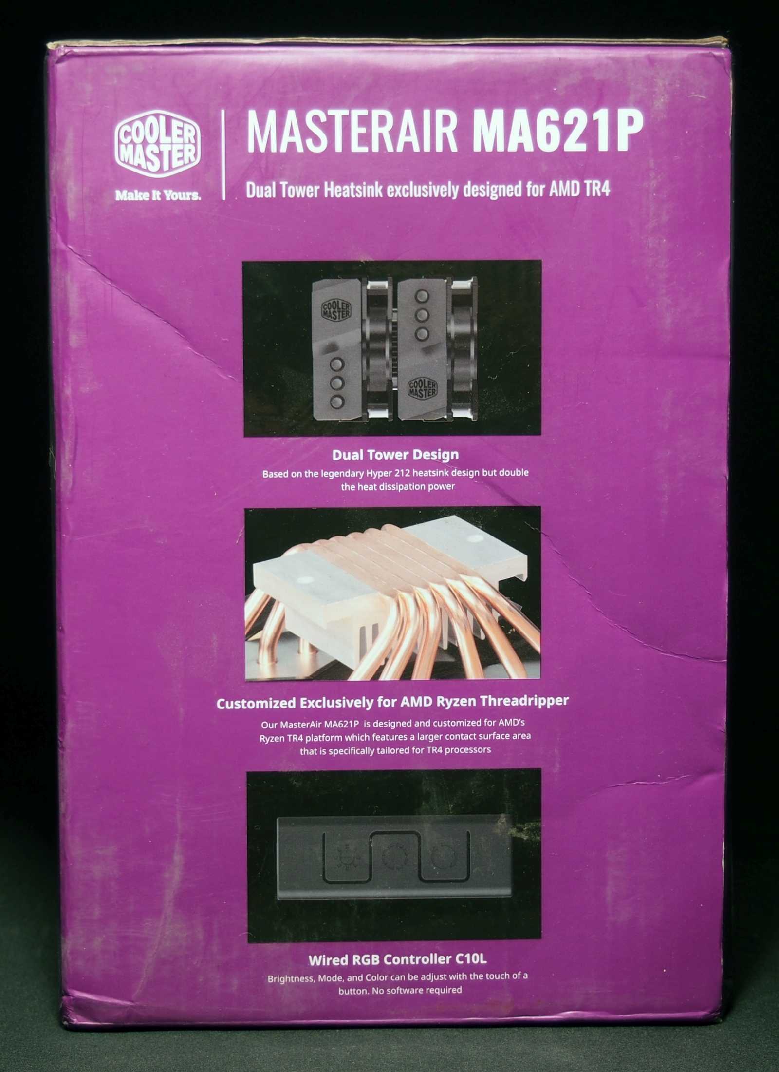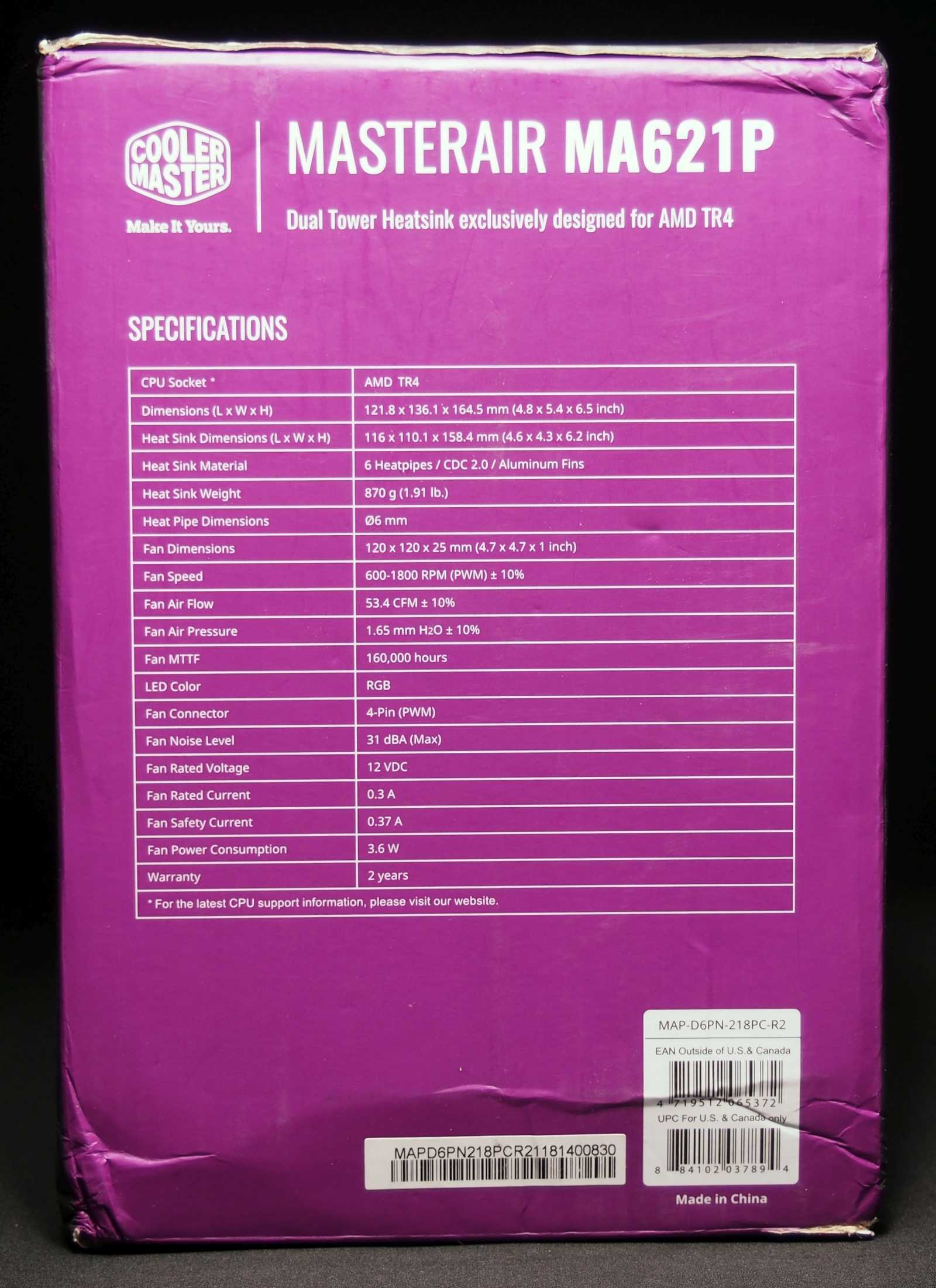Модель MasterAir MA621P поставляется в большой картонной упаковке вертикальной формы. В оформлении используются черный и сиреневый цвета, при помощи которых легко узнается производитель данного охладителя. На лицевой и тыльной стороне упаковки акцент сделан на внешнем виде и габаритах MasterAir MA621P.