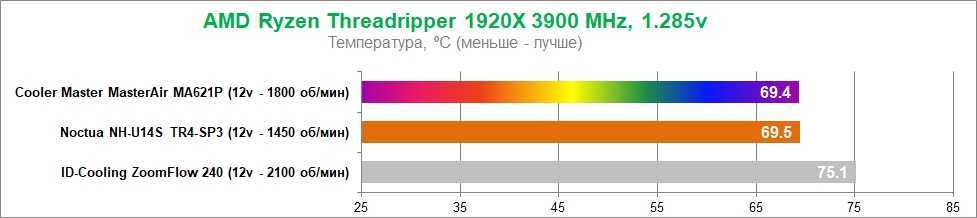 В тесте с разгоном AMD Ryzen Threadripper 1920X до 3900 МГц все системы охлаждения тестировались на максимальных оборотах вентиляторов. В этих условиях система жидкостного охлаждения ID-Cooling ZoomFlow 240 заняла место аутсайдера, в то время как MasterAir MA621P продолжал конкурировать на равных с Noctua NH-U14S TR4-SP3.
