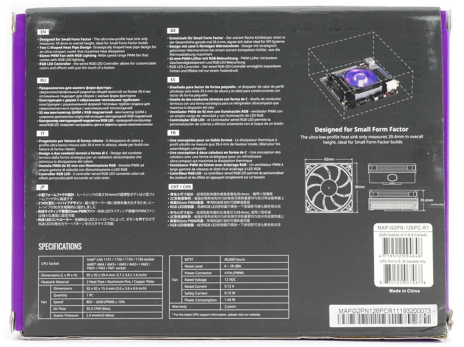 С обратной стороны производитель приводит краткое описание на восьми различных языках и столь удобную таблицу с техническими характеристиками. Для наиболее наглядной демонстрации габаритов «супер», то есть мини-кулера, показана иллюстрация системы охлаждения в собранном виде на материнской плате формата mini-ITX.