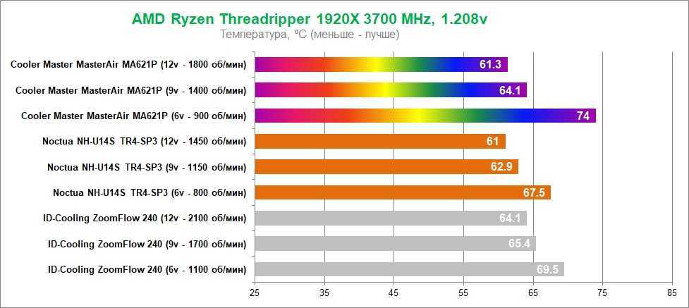 Процессор AMD Ryzen Threadripper 1920X был нагружен программой Prime95 в течение 10 минут, после чего мы снимали контрольные значения температуры утилитой HWiNFO64. Без разгона процессора охладитель MasterAir MA621P показал себя неплохо в сравнении с системой жидкостного охлаждения ID-Cooling ZoomFlow 240 и кулером Noctua NH-U14S TR4-SP3.