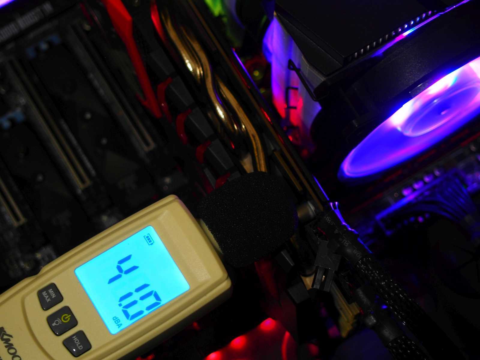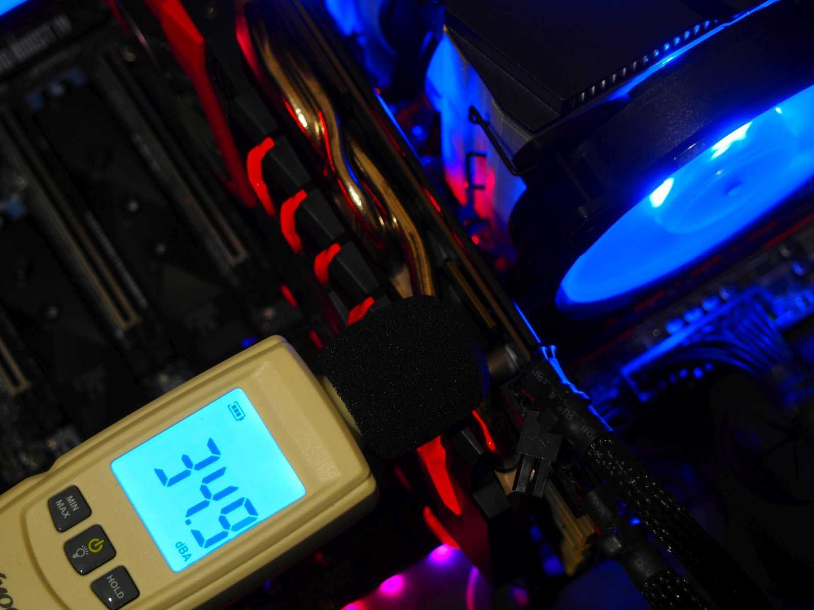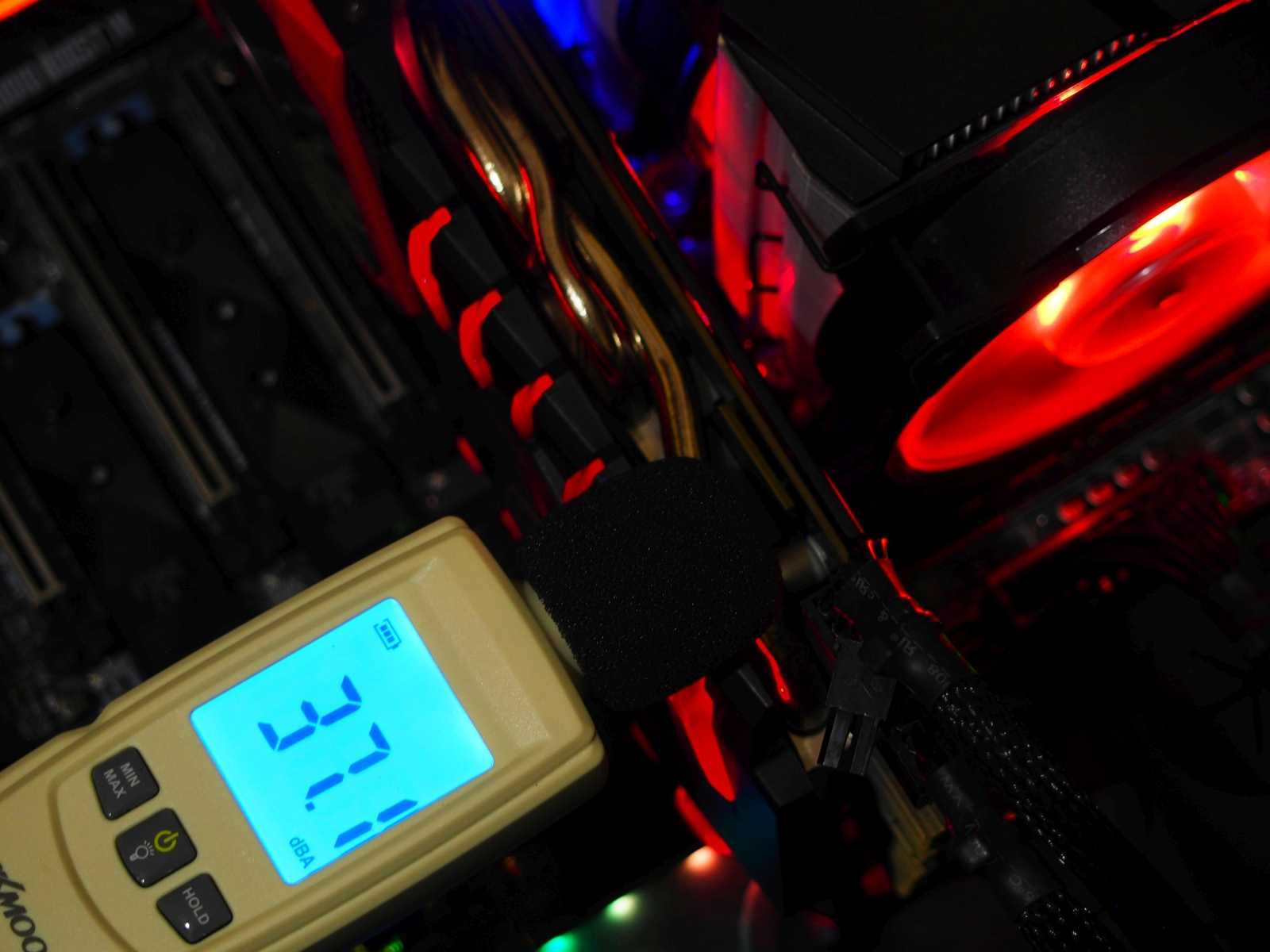 После Hyper 212 сразу же бросилась в глаза иная тональность работы. MasterAir Ma410M чуть более шумный, и несколько более басовитый. При этом громким его назвать нельзя, он тихий. Просто сразу после смены одного кулера на другой всё же слышна разница. К примеру, выводя утром ПК из спящего режима, нажатием кнопки на клавиатуре, не удаётся по звуку понять, включился ли компьютер или нет. То, что он проснулся, выдаёт лишь загоревшаяся подсветка. Вечером, когда вокруг значительно тише, всё же можно уловить тихий звук работы, доносящийся сбоку из-за стола. Но тут уже 2 трудящихся вентилятора, создающие мощный воздушный поток, что объясняет чуть большее количество децибел.