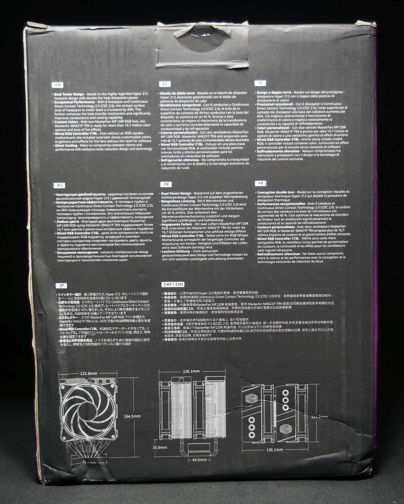 Боковые грани упаковки содержат информацию об особенностях конструкции MasterAir MA621P и подробные технические характеристики охладителя.