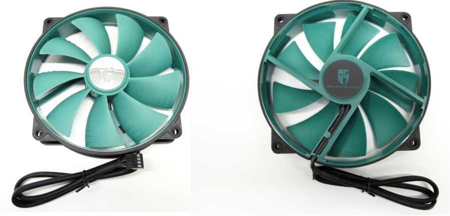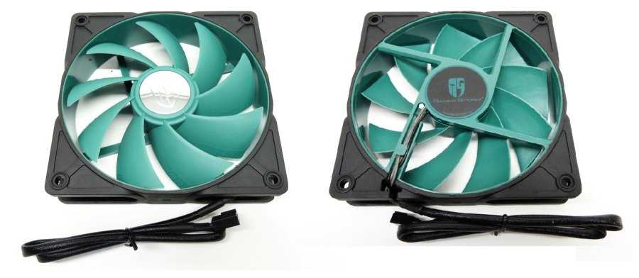 Система охлаждения оснащена двумя фирменными вентиляторами разного размера. Модели вентиляторов GF140 и GF120, что соответствует типоразмерам 140мм и 120мм. Но на самих вентиляторах модель не указана. Если посмотреть ассортимент GamerStorm, то можно найти идентичные вентиляторы с вышеуказанными названиями. Вентиляторы, которыми комплектуются системы охлаждения под брендом GamerStorm, имеют исключительно черно-красный окрас, а главное такие в розничной продаже не встретить.
