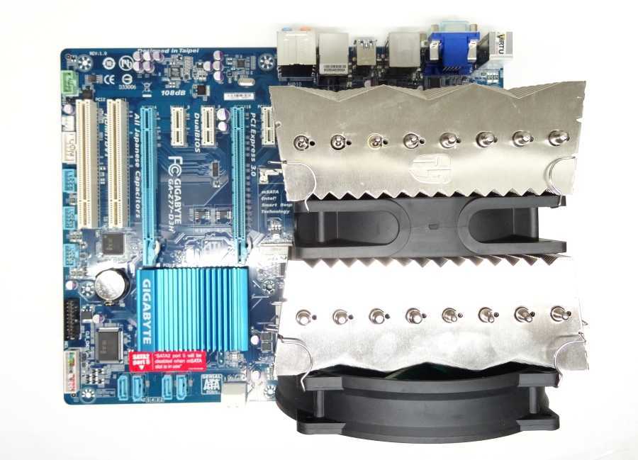 Общая площадь радиатора «наемного убийцы» составляет 12100см 2 . Между двумя секциями радиатора предусмотрен монтаж вентилятора типоразмера 140х140х25мм. Расстояние между секциями радиаторов составляет 28мм.