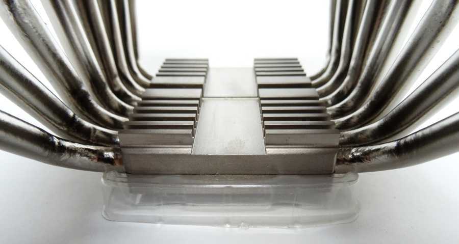 Основание теплосъемника состоит из двух никелированных медных пластин, между которыми зажаты тепловые трубки методом опрессовки. На выходе тепловых трубок из основания пайка отсутствует.