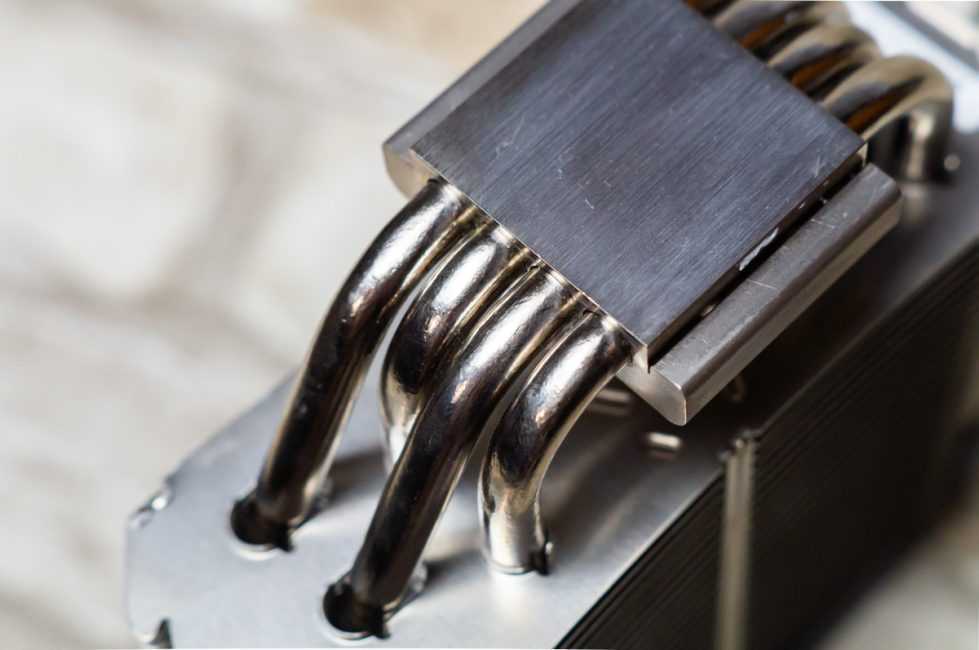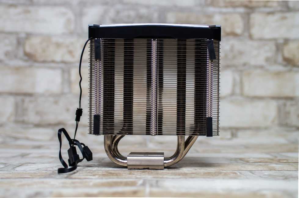 Нижняя часть кулера вполне традиционная, четыре медные теплотрубки без прямого контакта, полированная платформа и куча радиаторных пластин, пересекающих друг друга на конце.