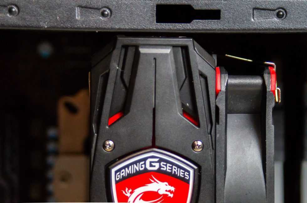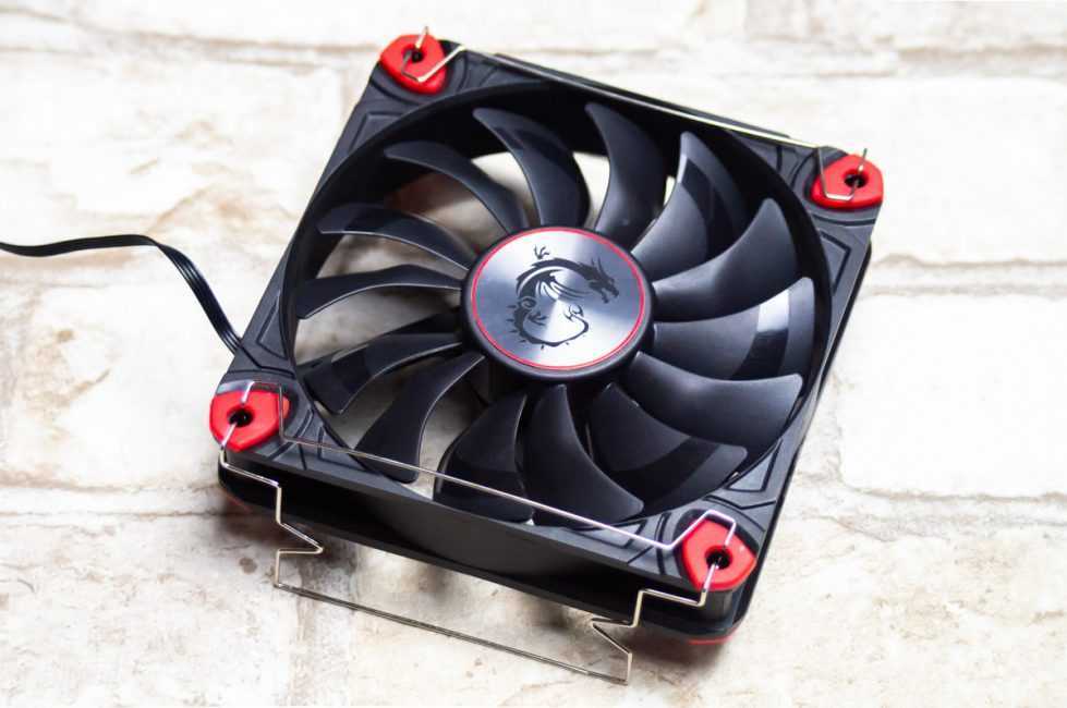 Комплектный вентилятор MSI TORX FAN по крутости тоже задних не пасёт. Это толстый 120-мм красавец на гидродинамическом подшипнике с прорезиненными по обе стороны ушками для крепления на кулер, с поддержкой ШИМ и глянцевым рисунком на каждой второй лопасти.