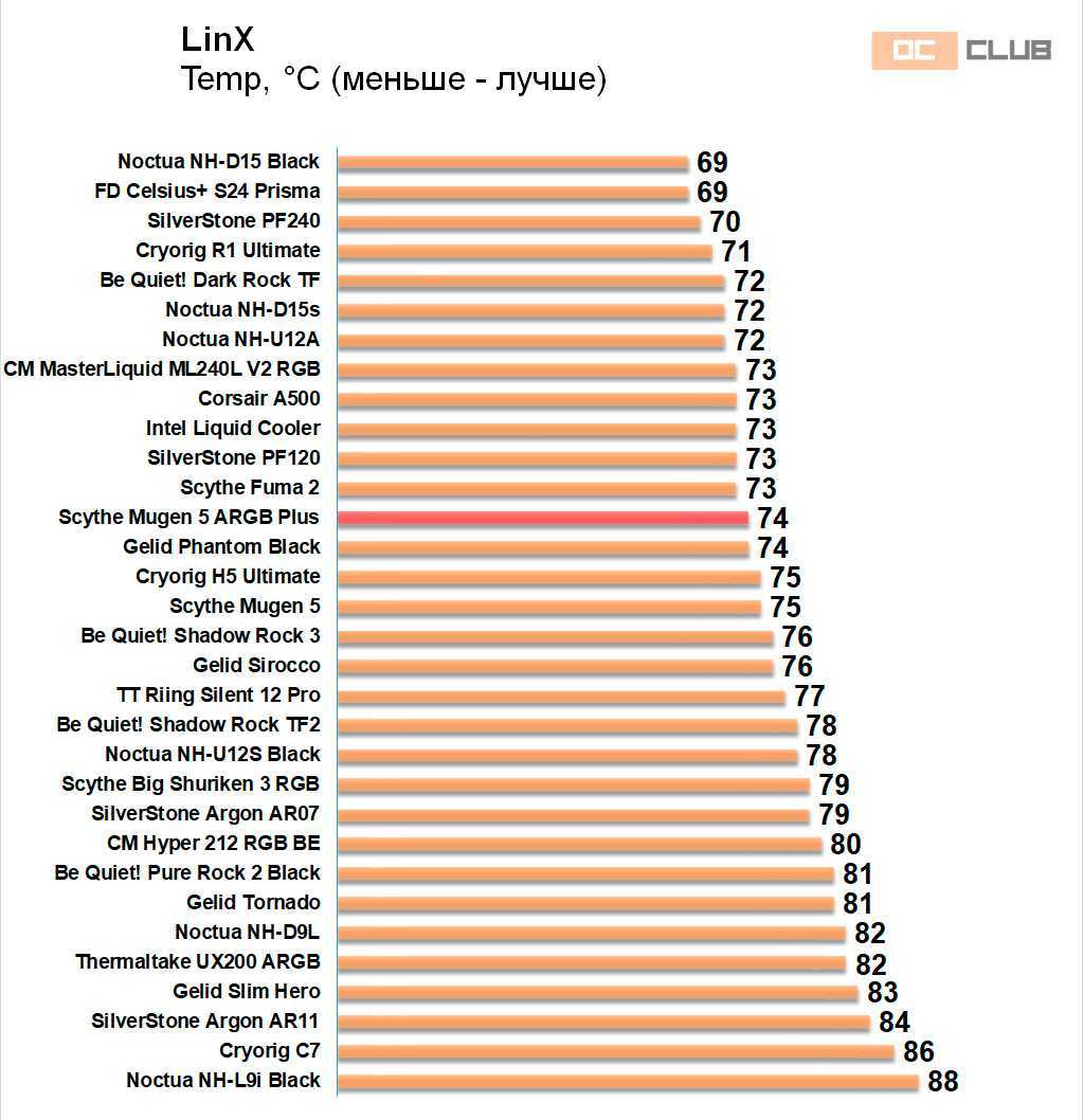 Для своих габаритов и конструкции, а также при учете довольно небольших оборотов пропеллеров в 1500 об/мин, Scythe Mugen 5 ARGB Plus демонстрирует отличную эффективность, превосходя почти все односекционные кулеры башенной конструкции.