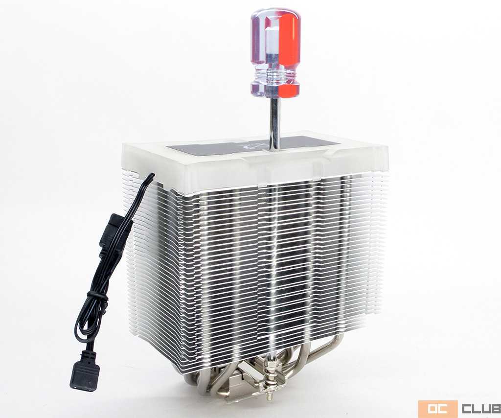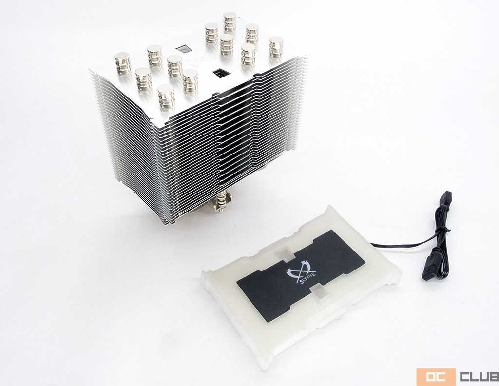 Верхняя часть радиатора прикрыта декоративной пластиной из полупрозрачного пластика. В неё встроены 18 адресных диодов. При желании пластину можно легко демонтировать. Отрадно, что кулер при этом не теряет во внешнем виде, поскольку концы тепловых трубок прикрыты металлическими заглушками, и на каждой пластине тиснённый логотип Scythe. Основание, теплотрубки и их заглушки никелированы, а непосредственно радиаторный стек из голого алюминия.