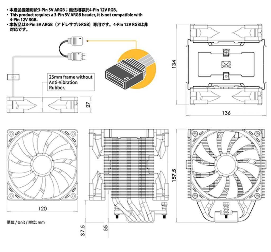 Кулер комплектуется двумя 120-мм пропеллерами серии Kaze Flex (KF1225FD15AR-P) для организации схемы “тяни-толкай”. Kaze Flex – вентиляторы очень и очень хорошие. Вообще они имеют стандартную толщину 25 мм, но точные японцы всюду указывают 27 мм. Просто антивибрационные проставки по углам выпирают с двух сторон по миллиметру.