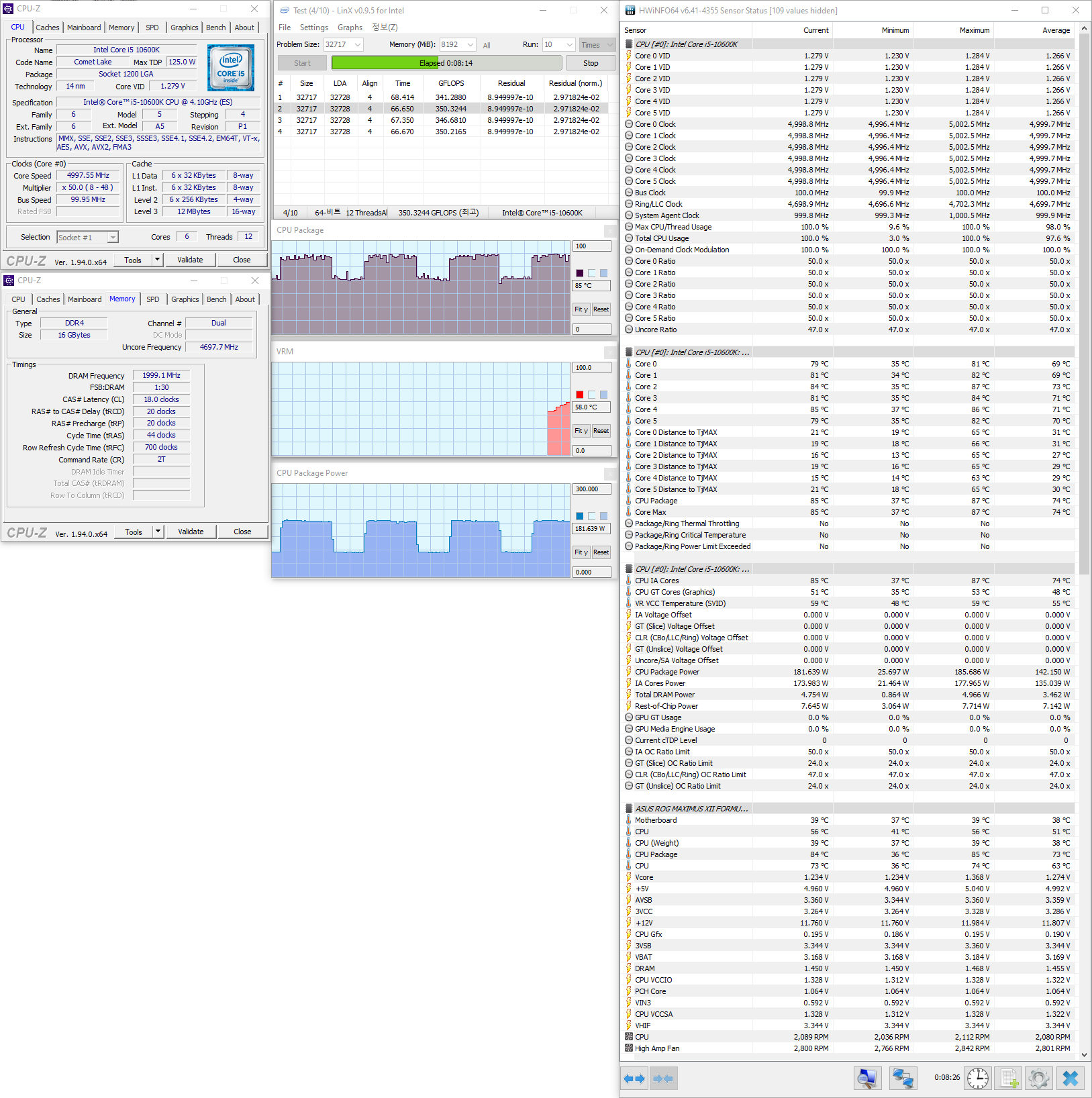 Произведем оверклокинг процессора Intel Core i5-10600K до отметки 5000 МГц при напряжении 1,35 В, что поднимет уровень потребления до 185 Вт.