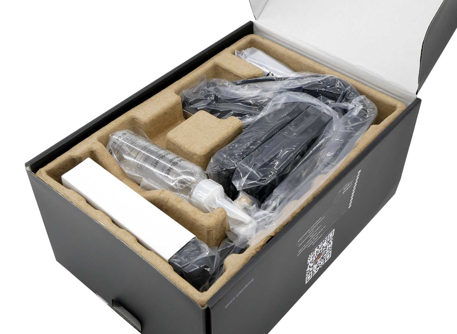 Открывая упаковку, наблюдаем тщательно уложенные элементы системы охлаждения и комплектацию в картонной форме и в индивидуальном пакетах.