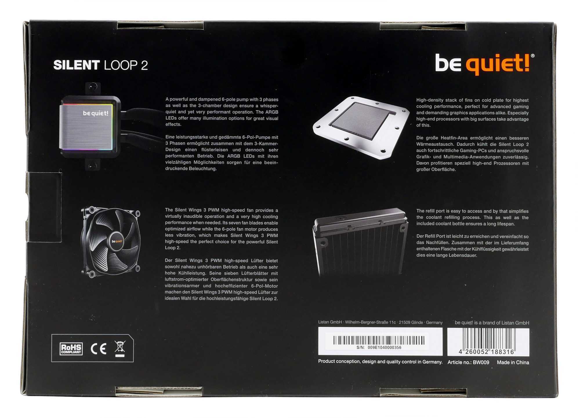 На обратной стороне производитель разместил не технические характеристики, которые редко кто читает, а сразу зашёл с козырей! be quiet! Silent Loop 2 120mm получила улучшенную помпу и дизайн корпуса, новинка использует пару вентиляторов Silent Wings 3 PWM high-speed, зарекомендовавших себя с лучшей стороны. В основании располагается медный никелированный водоблок с микроканальной структурой нового образца, а в теле радиатора располагается заправочное отверстие.