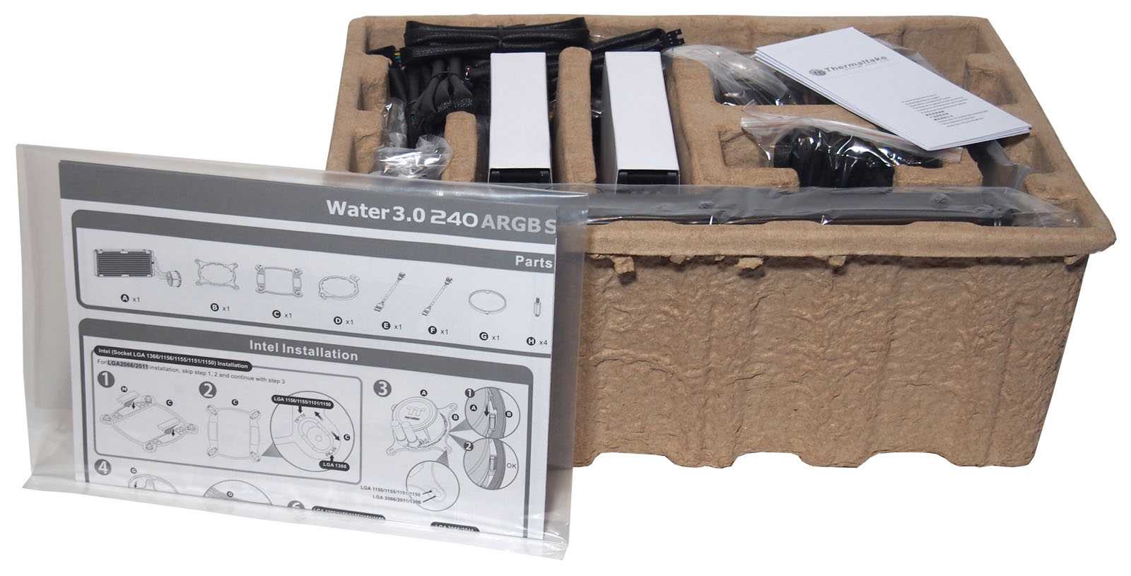 Внутри коробки расположен гофрокартонный вкладыш с отсеками по форме отдельных компонентов, надежно защищающий устройство во время транспортировки. Радиатор и водоблок дополнительно уложены в полиэтиленовый пакет, чтобы исключить попадание мелкого мусора и пыли.
