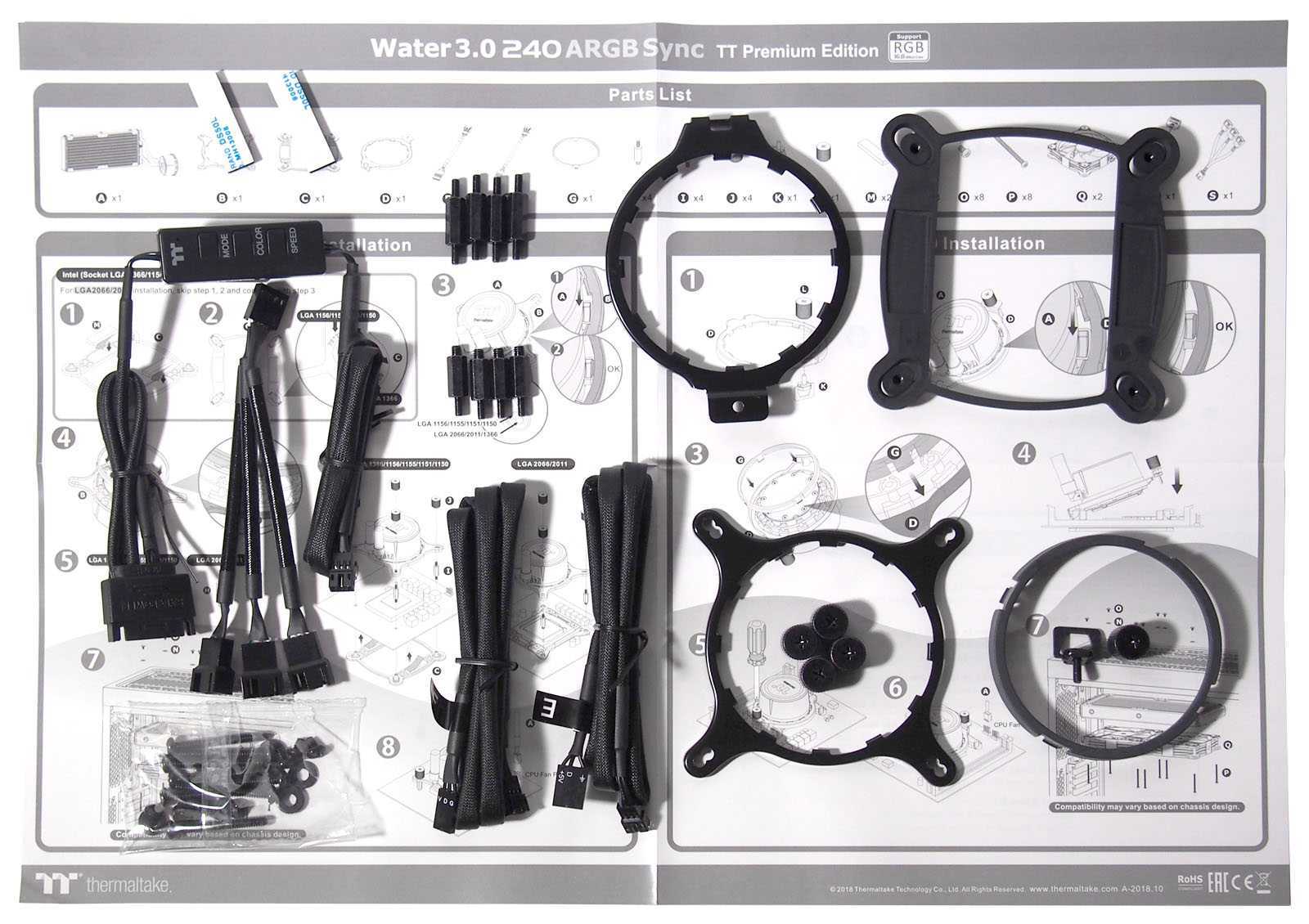 В комплект поставки входят стандартные крепления, наборы винтов и втулок, упаковка винтов для радиатора с вентиляторами, инструкция по сборке, а также кабель для подключения подсветки к материнской плате.