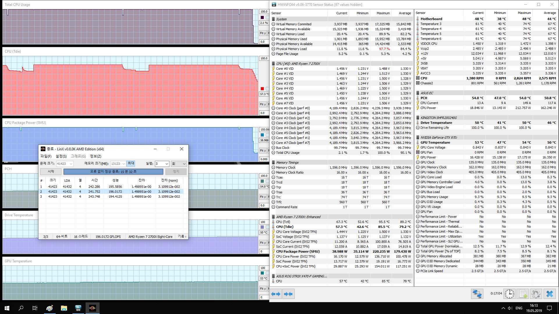 Корпус тестового стенда №1 отличается местом под СЖО за передней панелью со слабой перфорацией, сильно влияющей на приток воздуха и эффективность охлаждения. Пример показаний с температурных датчиков комплектующих в стенде №1 при стресс-тестировании в LinX 0.8.0K в закрытом корпусе Aerocool Rift BG: