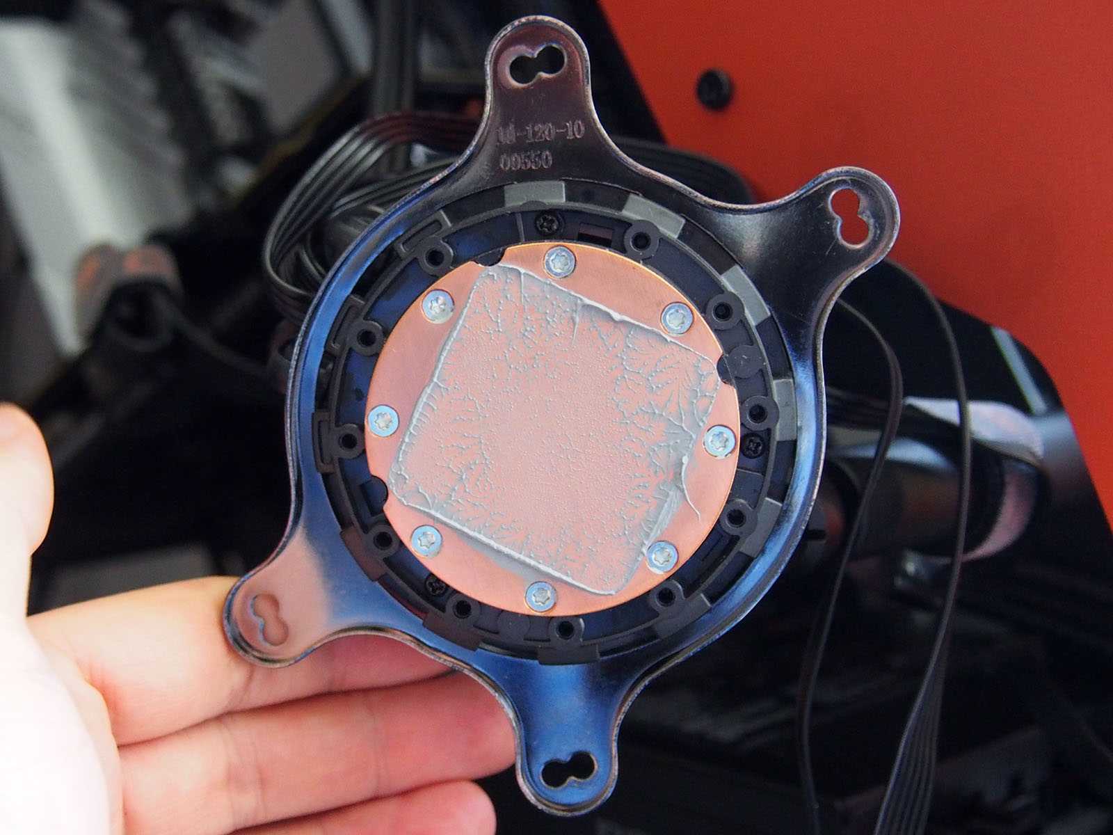 Контактная пластина радиатора помпы ровная, на ней заметны следы фрезы. Прикручена винтами с треугольным шлицем. Без специальной отвёртки или ключа разобрать не получится.