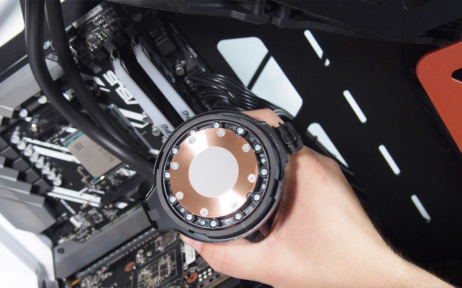 Монтаж водянки ASUS ROG Ryuo 240 проста и почти ничем не отличается от установки любой другой СВО. Если речь идёт о сокете Intel LGA 1151, то сперва потребуется установить на обратную сторону матплаты бэкплейт, зафиксировать его шпильками со стороны чипсета, а затем установить водоблок и затянуть его гайками.