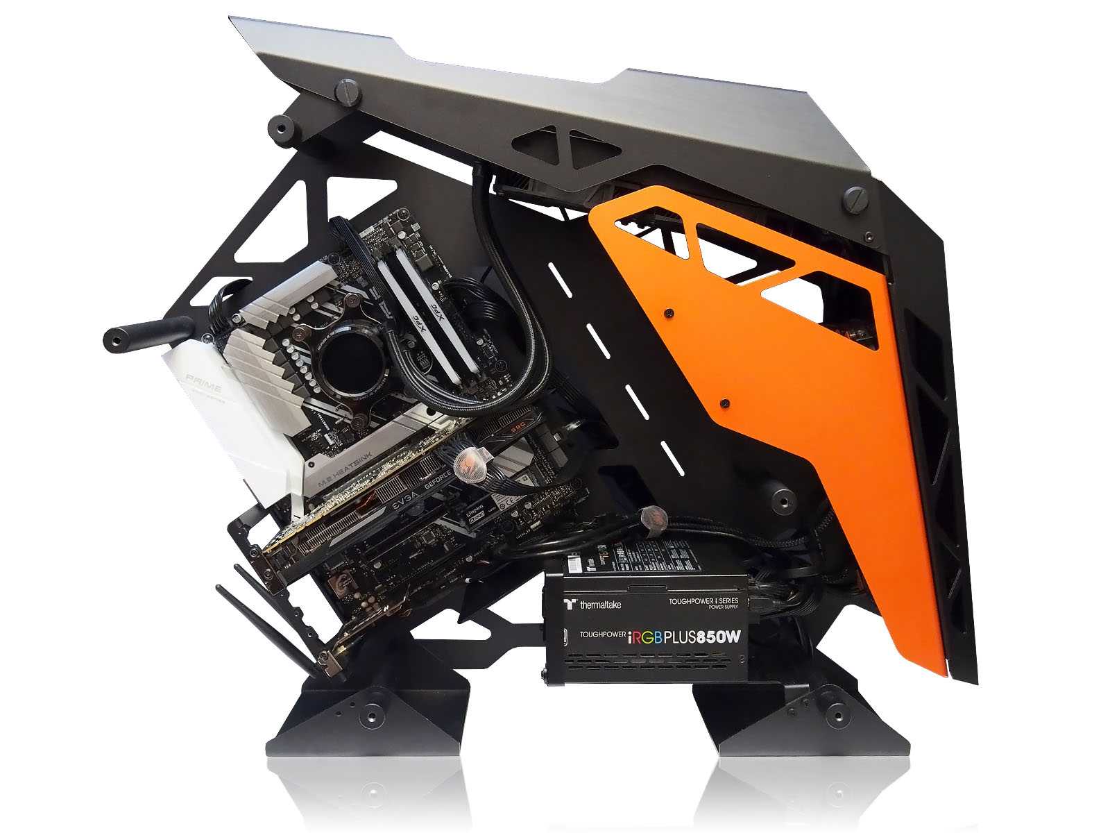 Радиатор окрашен в чёрный цвет. Матовая текстурная краска. От него отходят два шланга, в твёрдой оплётке под которой уложены также провода питания и RGB.