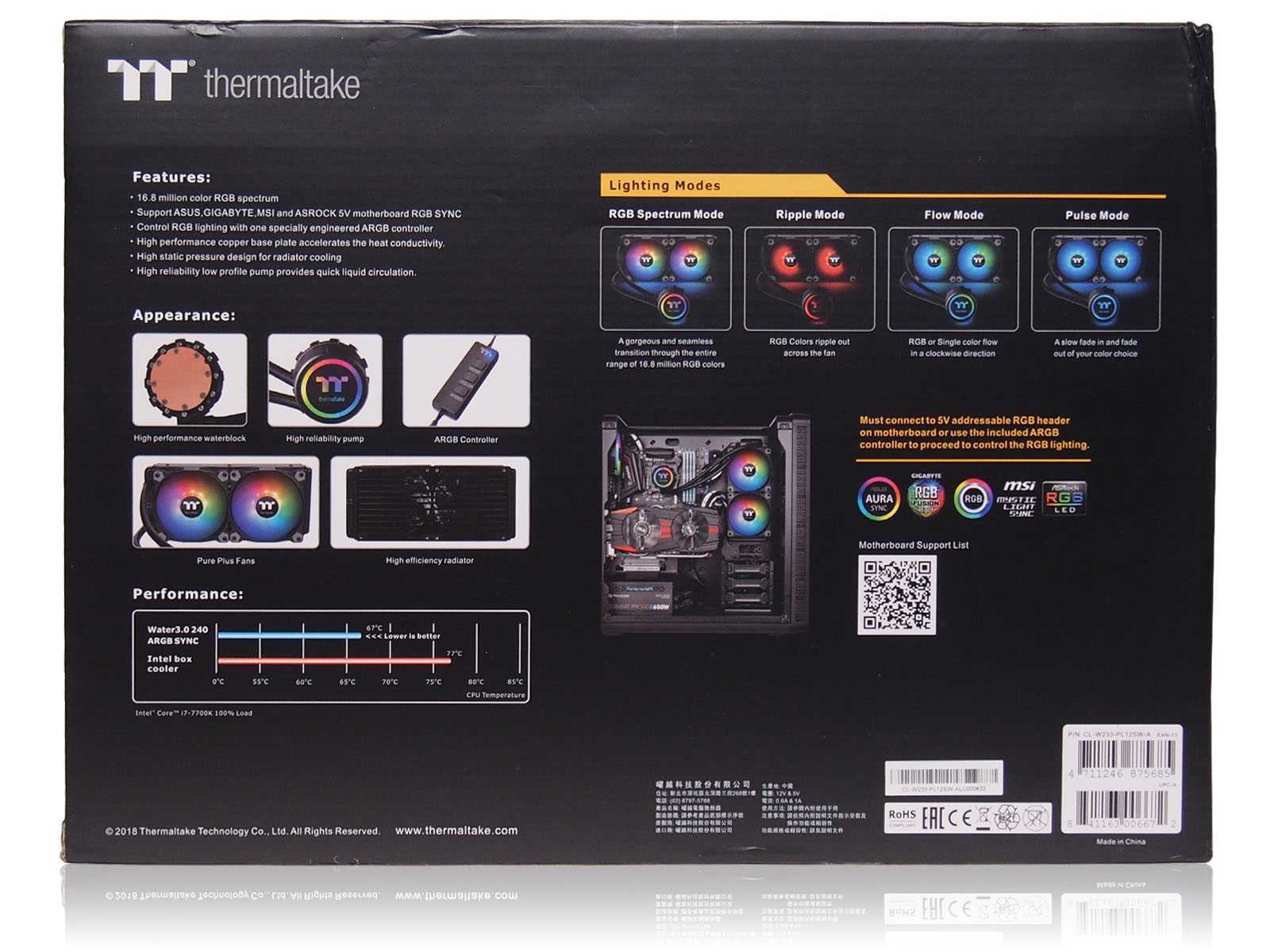 В комплекте с Thermaltake Water 3.0 240 ARGB Sync идёт всё необходимое для запуска системы охлаждения, как в сборках с материнскими платами, поддерживающими управление пятивольтовыми светодиодными лентами, так и без нужных разъёмов. В последнем случае пригодится комплектный контроллер эффектов подсветки.