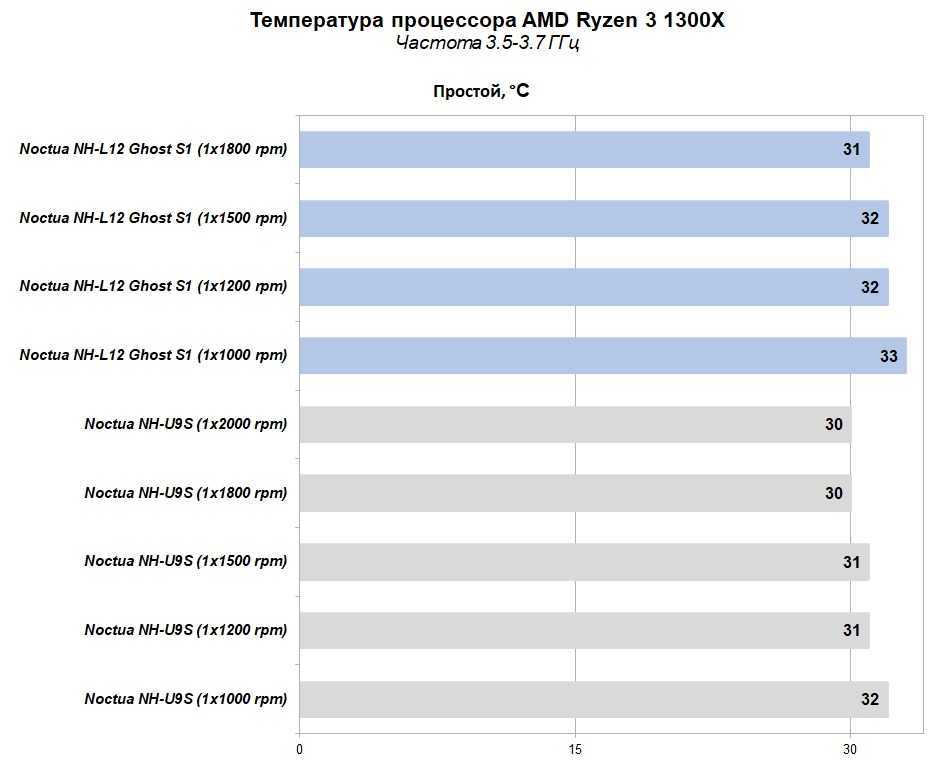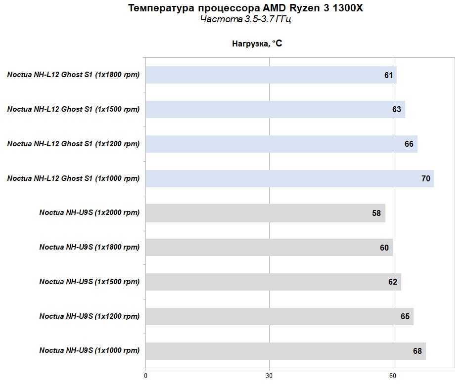 Отдельно мы провели тест кулера Noctua NH-L12 Ghost S1 Edition с процессором AMD Ryzen 7 1700X (TDP 95 Вт). Естественно, температура оказались выше, и с учетом повышенной температуры окружающей среды 26,2 °С кулер смог обеспечить охлаждение (72-75 °С) только при высоких оборотах вентилятора 1500-1800 rpm. Главное, чтобы была вентиляция внутри корпуса.