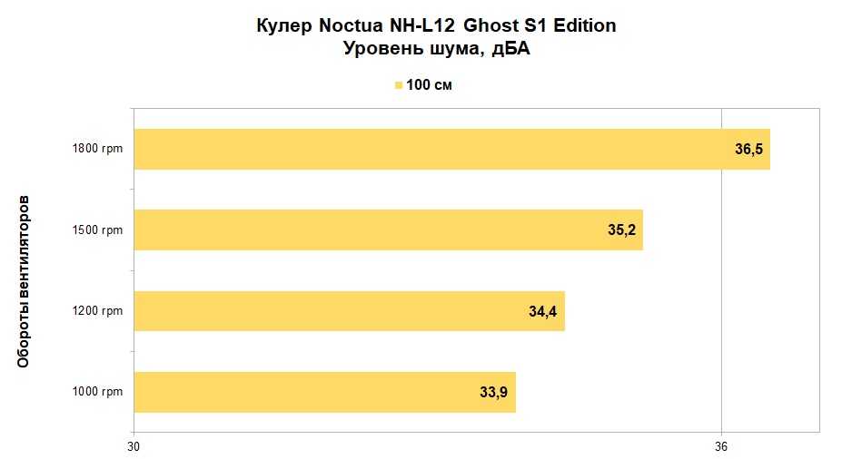 По замерам температур низкопрофильный кулер Noctua NH-L12 Ghost S1 Edition не сильно отстает от эталонного башенного кулера Noctua NH-U9S, имеющего пять медных тепловых трубок – проигрыш составляет 1-2 °С при одинаковых оборотах вентиляторов. Для компактного кулера это весьма неплохой результат.