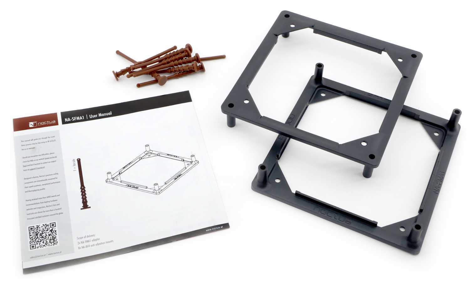 Впервые за долгое время знакомства с продукцией Noctuaу нас возникли существенные претензии. Штатный состав крепежа явным образом отличается в худшую сторону от прорезиненных уголков, рамок, других гвоздей и т.п. Штатные стяжки оказались значительно хуже и рассыпались, с легкостью рвались и в процессе подготовки материала две были уничтожены. Поэтому рекомендация от автора носит следующий характер: внимательность и аккуратность при монтаже NA-SFMA1 в полном объеме.