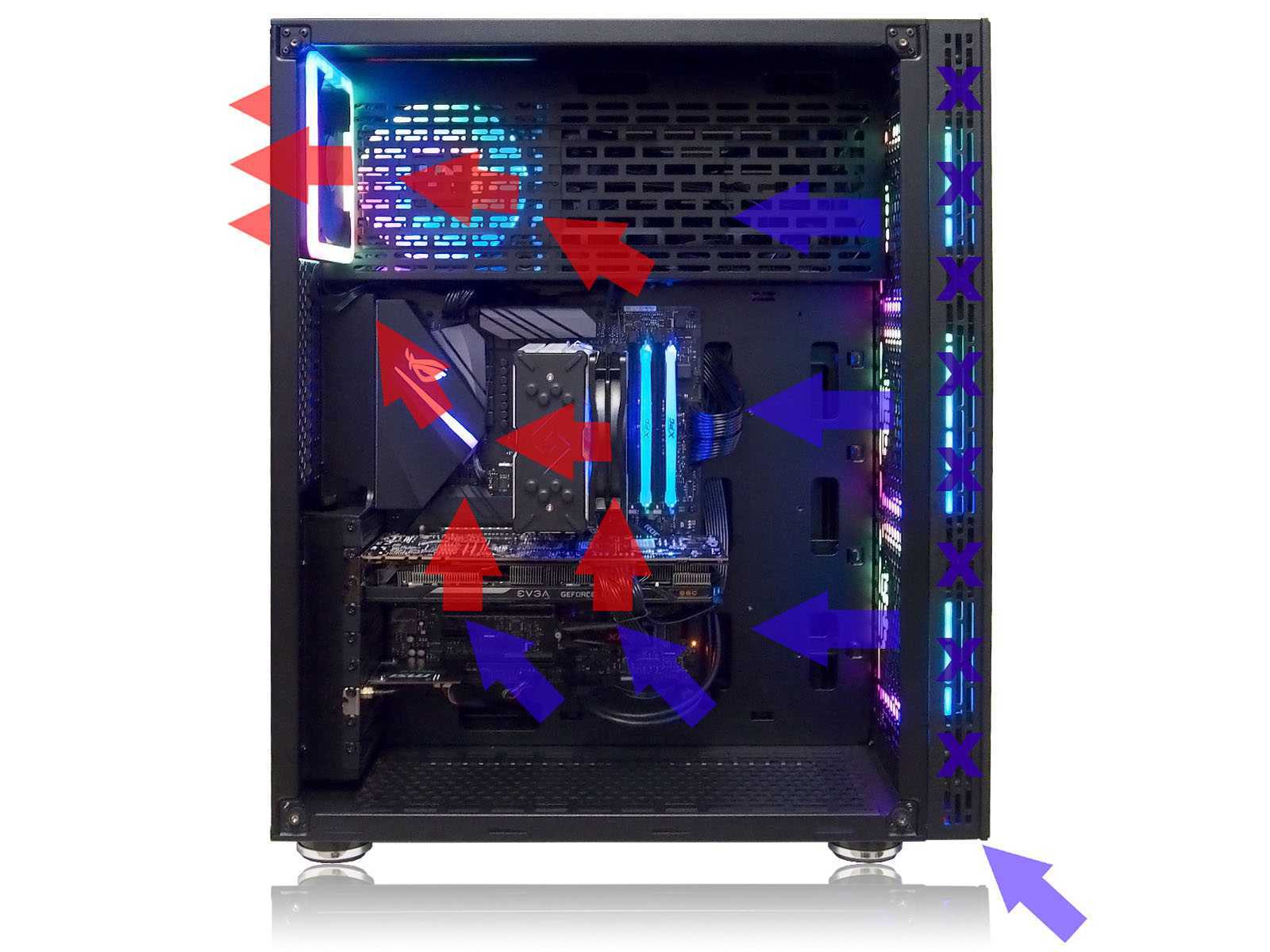 Учитывая малое количество вентиляционных отверстий спереди и близкое расположение фронтальных вентиляторов к стеклу на передней панели, корпус «задыхается» от слабого притока холодного воздуха снаружи. Три вентилятора спереди смотрятся красиво, но если собирать корпус с точки зрения хорошей продуваемости, то логичнее парочку переместить вниз, тем более, что там как раз стоит пылевой фильтр. Поэтому видится два логичных варианта оптимизации базовой конфигурации: первый — установить два комплектных вентилятора на задней стенке и два на нижней, пожертвовав «ARGB-фасадом» спереди, второй — включить штатные вентиляторы на минимальную скорость и добавить парочку приточных вентиляторов вниз, возможно, даже чисто чёрного цвета и без подсветки, чтобы не выделяться за тонированным стеклом.