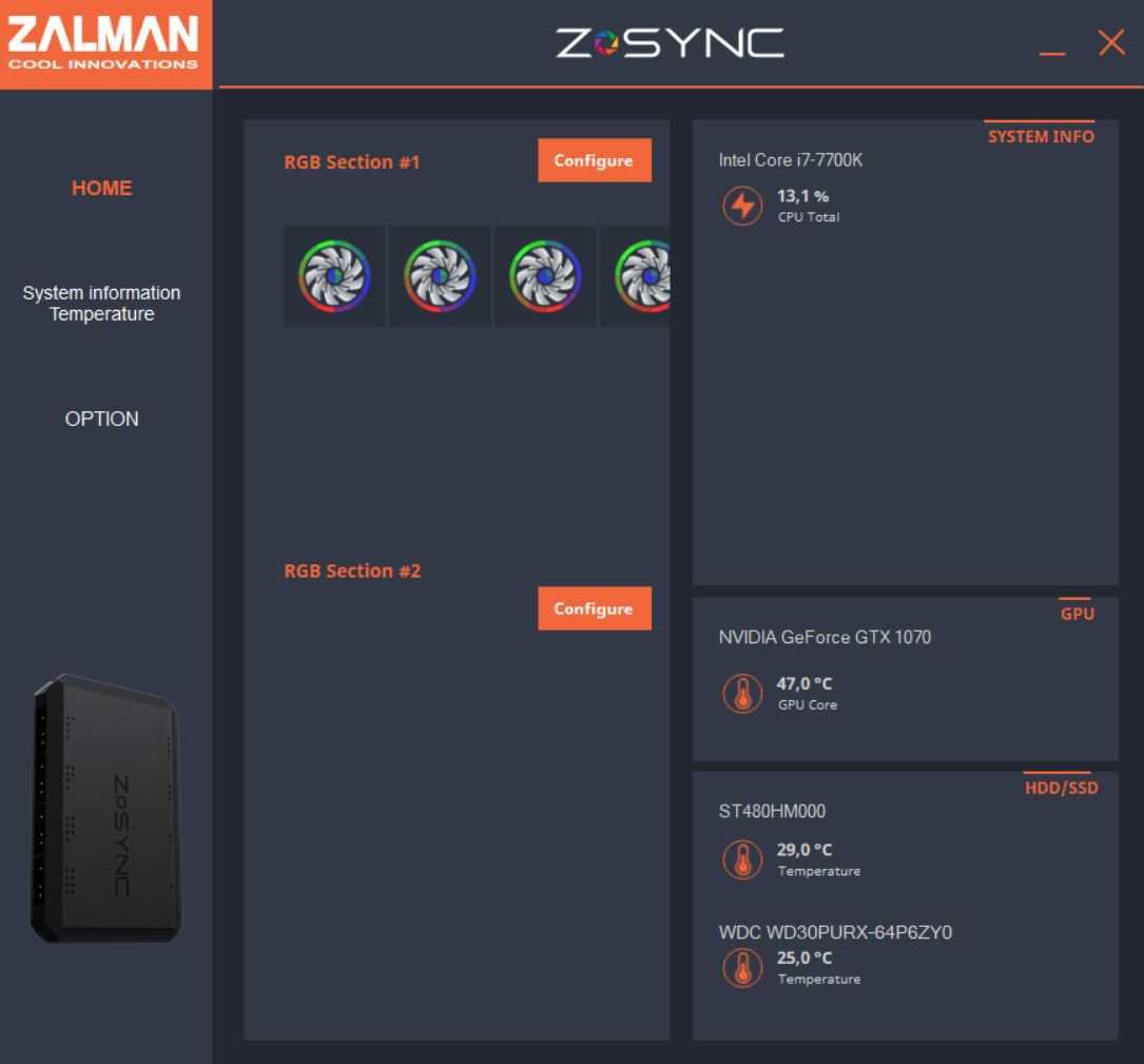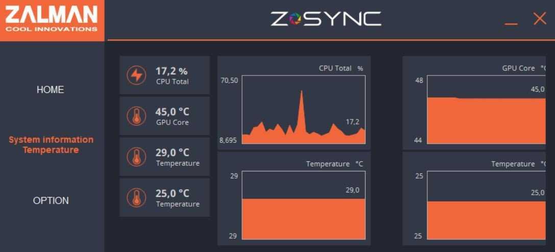 Home – визуально отображаются вентиляторы в двух секциях. Во второй колонке — системная информация о нагрузке и температуре CPU, GPU, HDD.