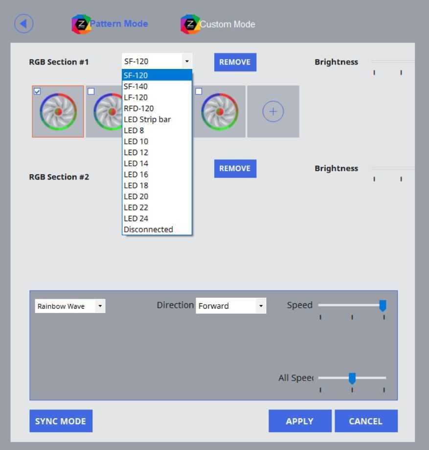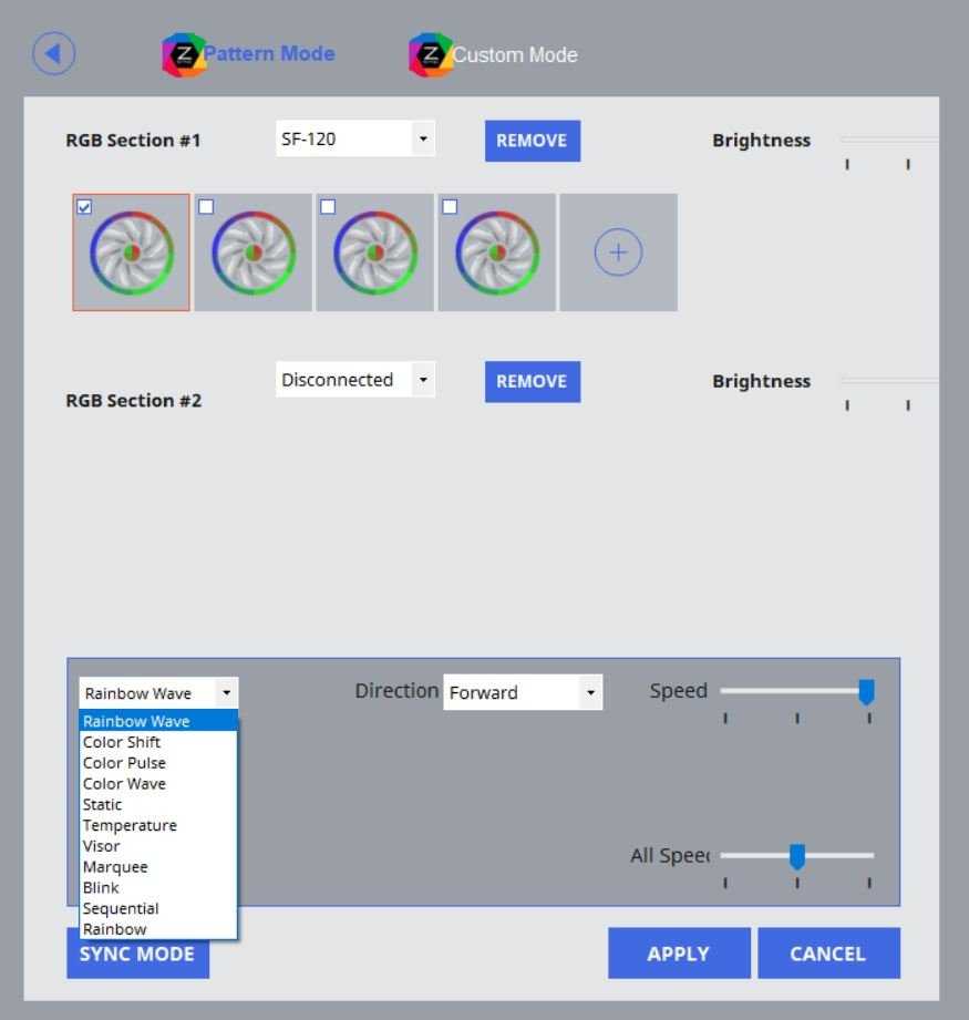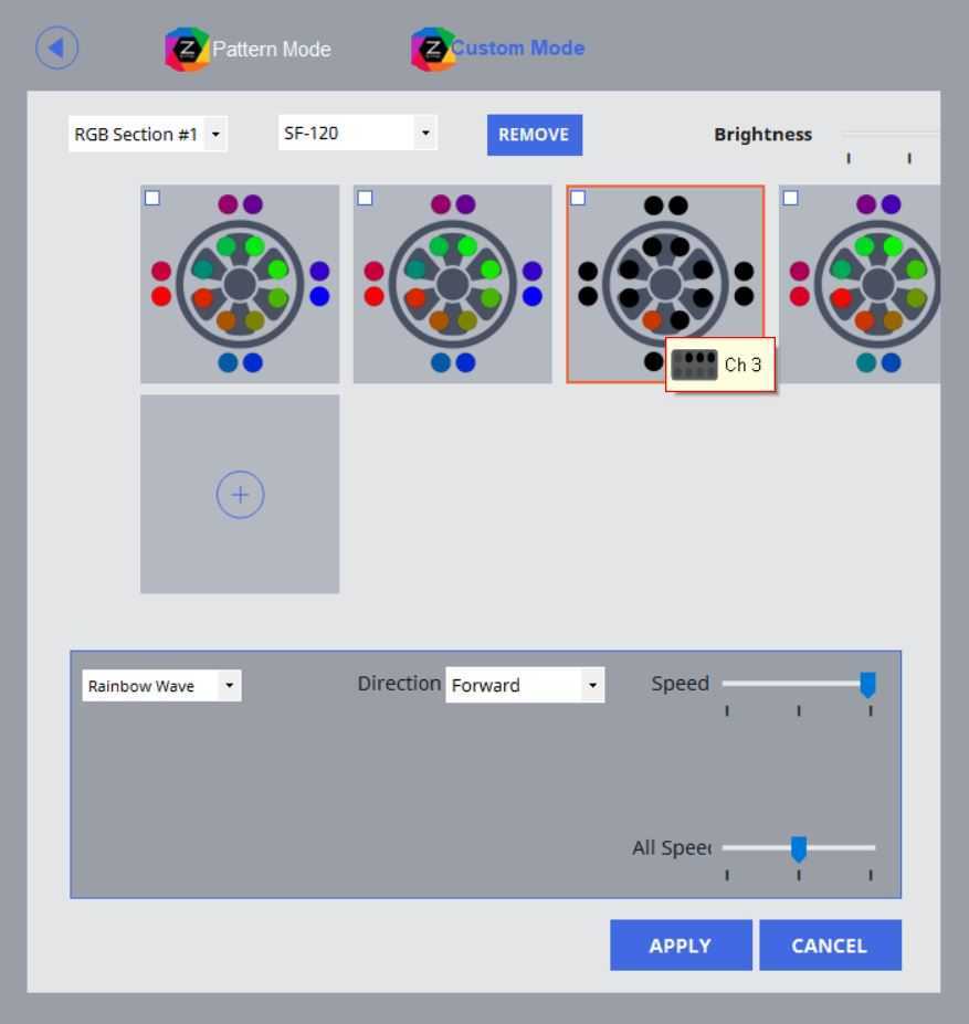 В режиме шаблона настраивается подсветка всего вентилятора или выбранных вентиляторов по списку из 11 предустановленных шаблонов. Изменить можно яркость, скорость, направление движения подсветки. В некоторых шаблонах можно выбрать предпочтительные цвета на усмотрение пользователя или случайный выбор цветов.