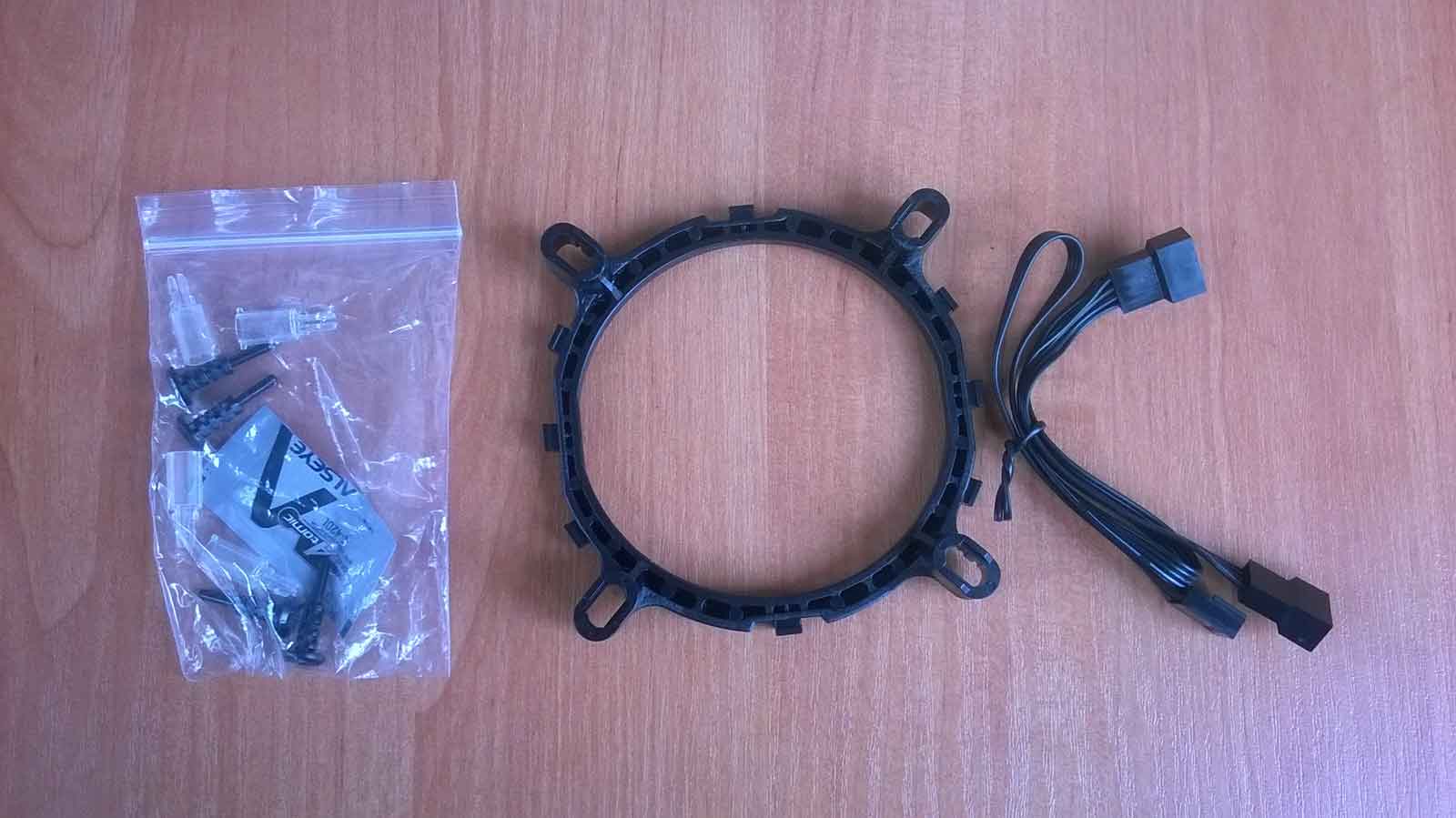 Также стоит немного остановиться на комплектующих Alseye Eddy-120r. Он доставляется уже в собранном виде с установленными кулерами. В комплекте идет сплиттер для подключений обоих кулеров в один разъем, крепление для материнских плат, работающих с процессорами Intel, а также термопаста.