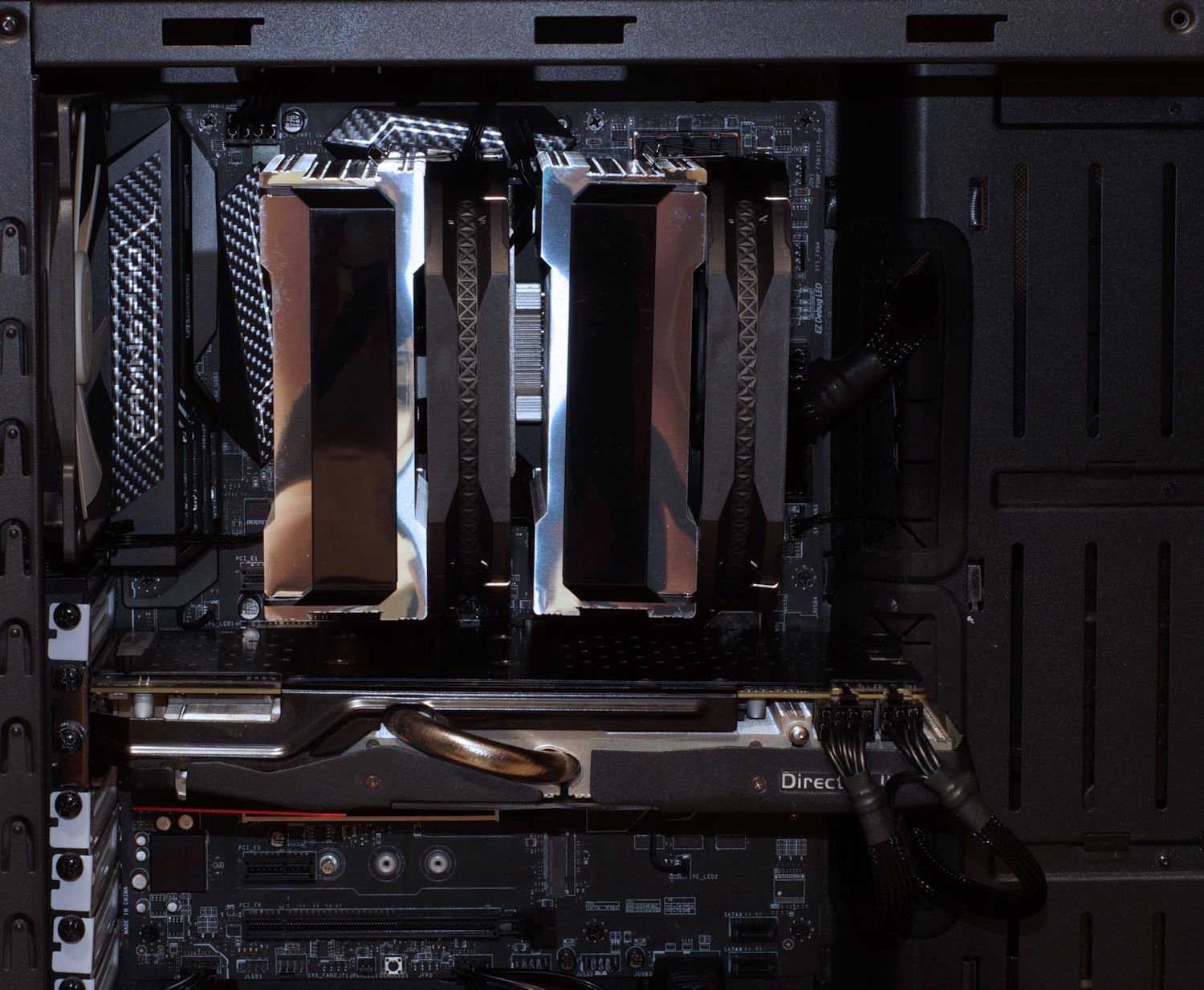 Суперкулер Deepcool Assassin III не имеет новомодной RGB-подсветки, но все равно смотрится внутри корпуса неплохо. Стоит только отметить, что из-за размеров он перекрывает слоты оперативной памяти, поэтому если используется память с высокими радиаторами, то передний вентилятор придется снять, либо разместить его выше, отчего увеличится высота кулера.