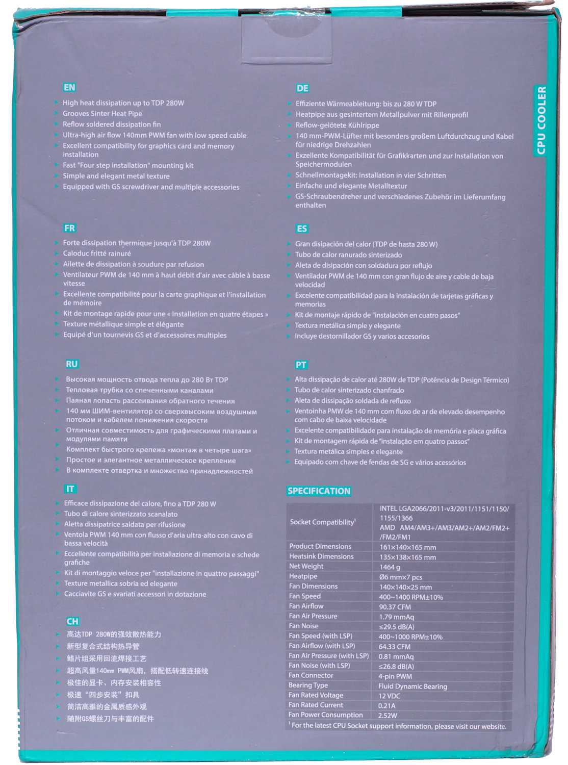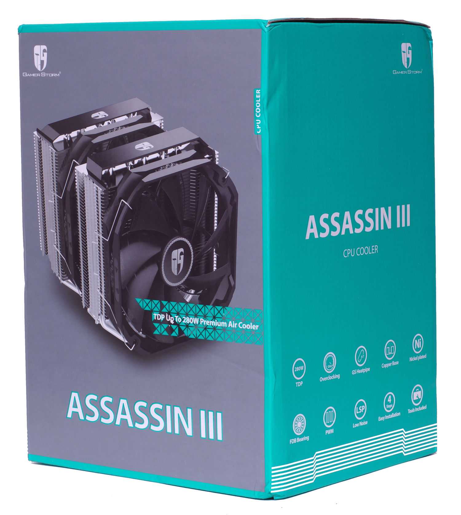 Компания Deepcool выпускает системы охлаждения, ориентированные на разные сегменты рынка, и для премиум-уровня у производителя имеется бренд Gamer Storm с соответствующим фирменным оформлением упаковок, к которому как раз относится новинка. В случае суперкулера Deepcool Assassin III на ней указана отводимая тепловая мощность (TDP) до 280 Вт, отмечены фирменные ключевые технологии, такие как тепловые трубки со спекание нового вида, паянные лопасти для достижения высокой производительности при минимальном уровне шума, а также использование простого монтажа и максимальной комплектации. На коробке размещены технические характеристики с указанием совместимых платформ: Intel LGA115x/1366/2011 (-3)/2066 и AMD FM1/FM2 (+)/AM2 (+)/AM3 (+)/AM4.