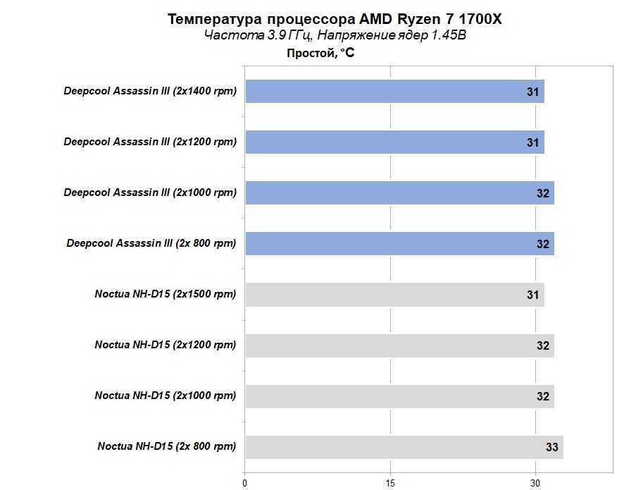 А вот температура разогнанного процессора AMD Ryzen 7 1700X говорит сама за себя. Суперкулер Deepcool Assassin III имеет незначительное преимущество (1-2 °С) относительно эталона Noctua NH-D15 при различных оборотах вентиляторов. Особенно он хорош при минимальных оборотах вентиляторов, и это отличный показатель!
