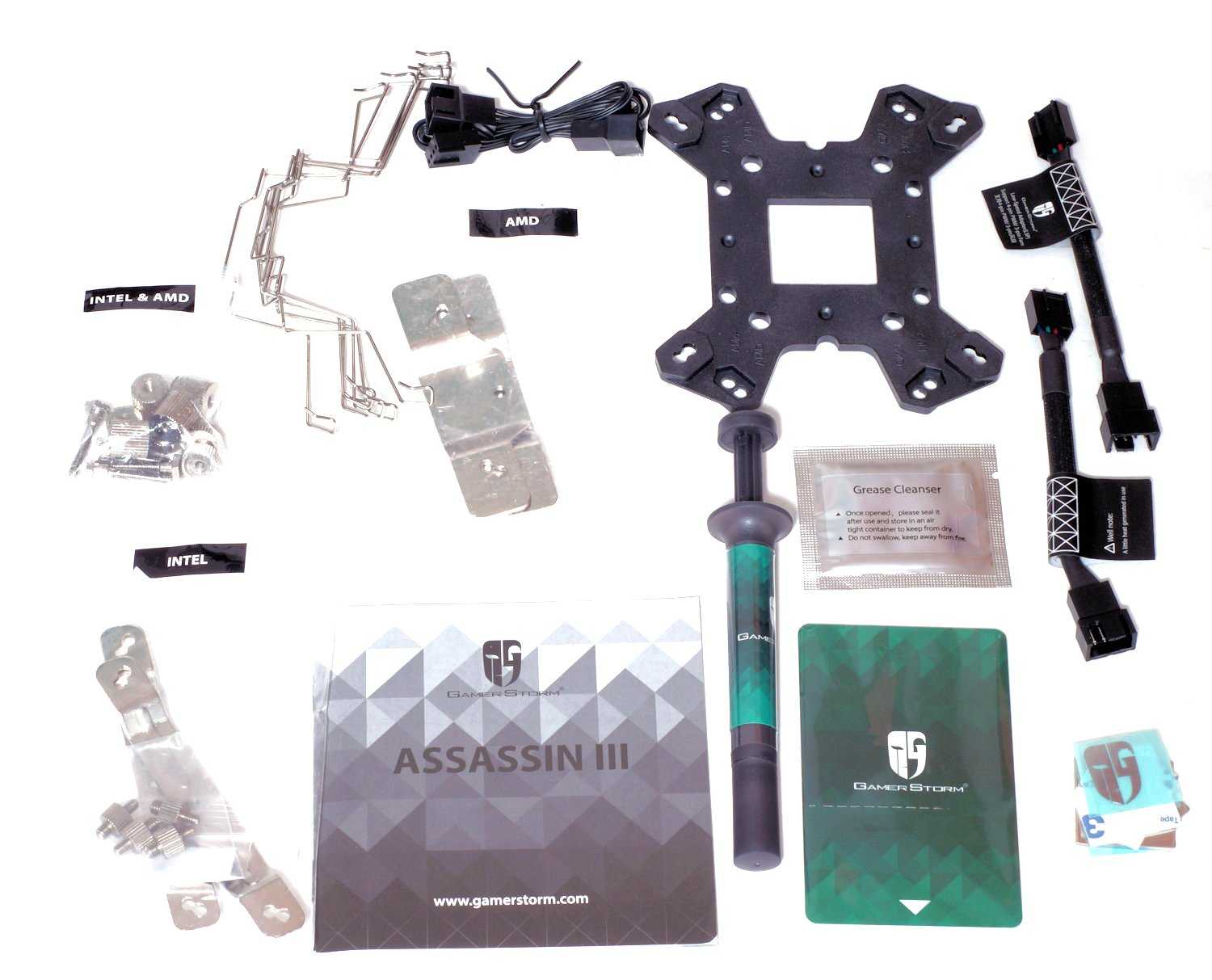 Комплектация у суперкулера солидная. Помимо необходимых креплений для платформ AMD/Intel и термопасты в коробке можно обнаружить пластиковую карту для удобного нанесения термопасты, адаптер LSP для ограничения максимальных оборотов вентиляторов, Y-кабель, чистящее средство, наклейку Gamer Storm, комплекты скоб для установки трех вентиляторов и, конечно же, отвертку.