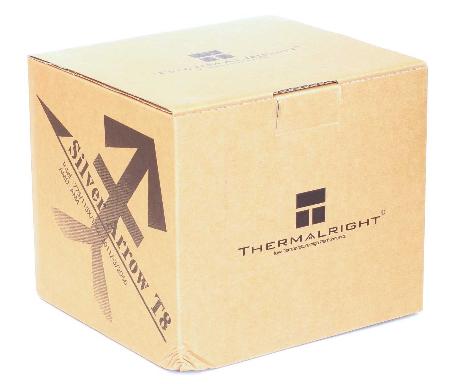 Дизайн «серебряной стрелы» хорошо узнается в кулере Thermalright Silver Arrow T8, хотя он оснащается только одним 140 мм вентилятором. Вместе с темкулерпо-прежнемусмотрится солидно и эффектно, позволяя отводить до 320 Вт тепла от процессоров с сокетами AMD AM4/Intel LGA775/115x/1366/2011(-3)/2066. Для сокета AMD TR4 производительчуть ранеевыпустил другую модель Thermalright Silver Arrow TR4.