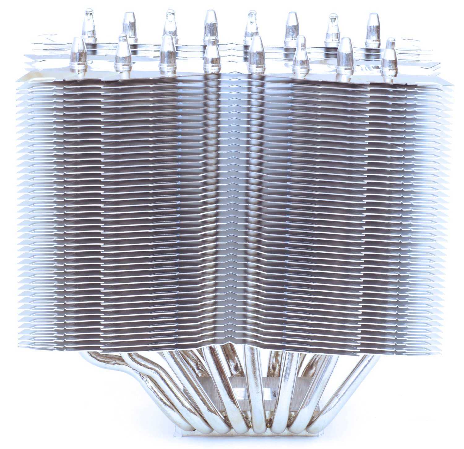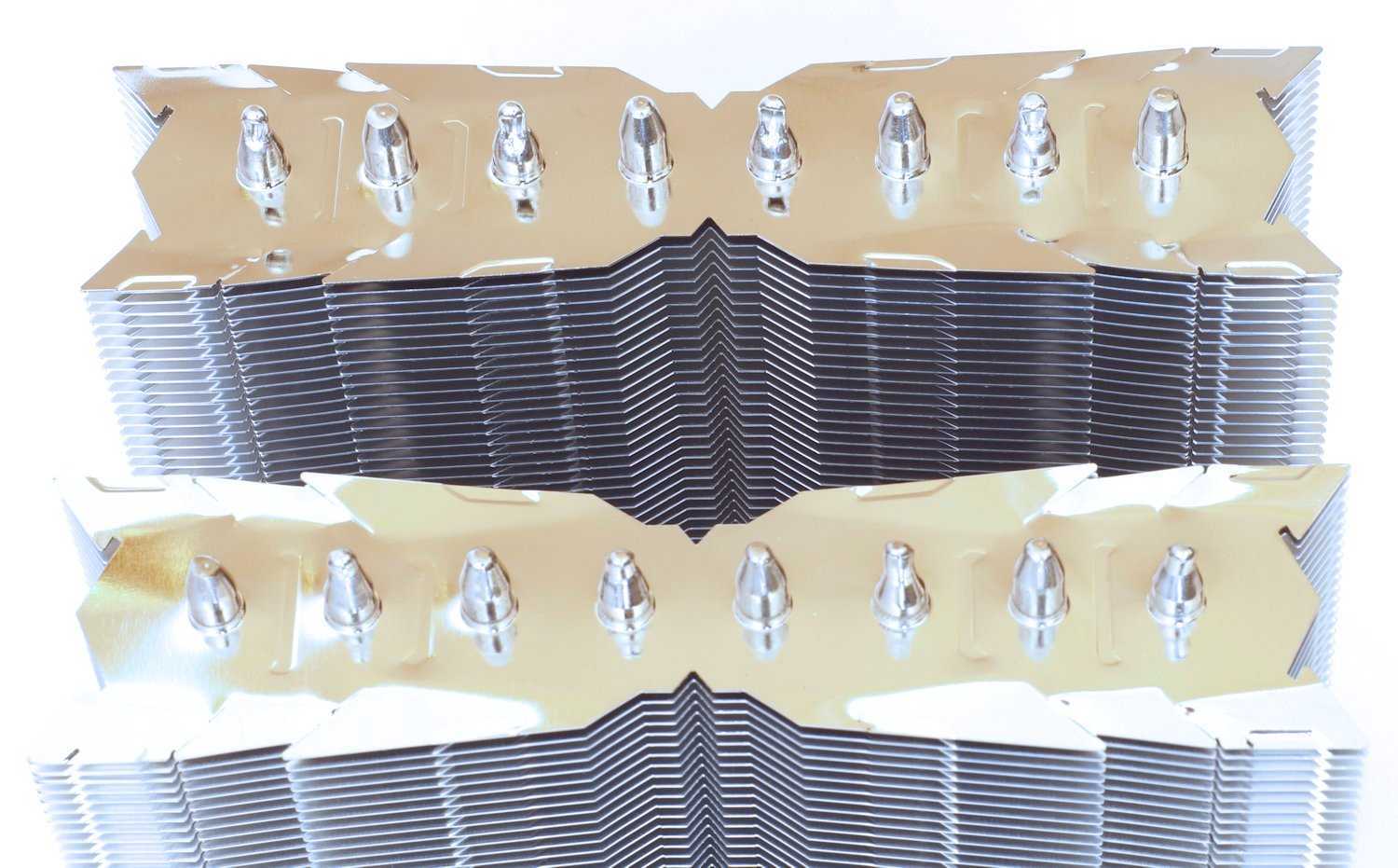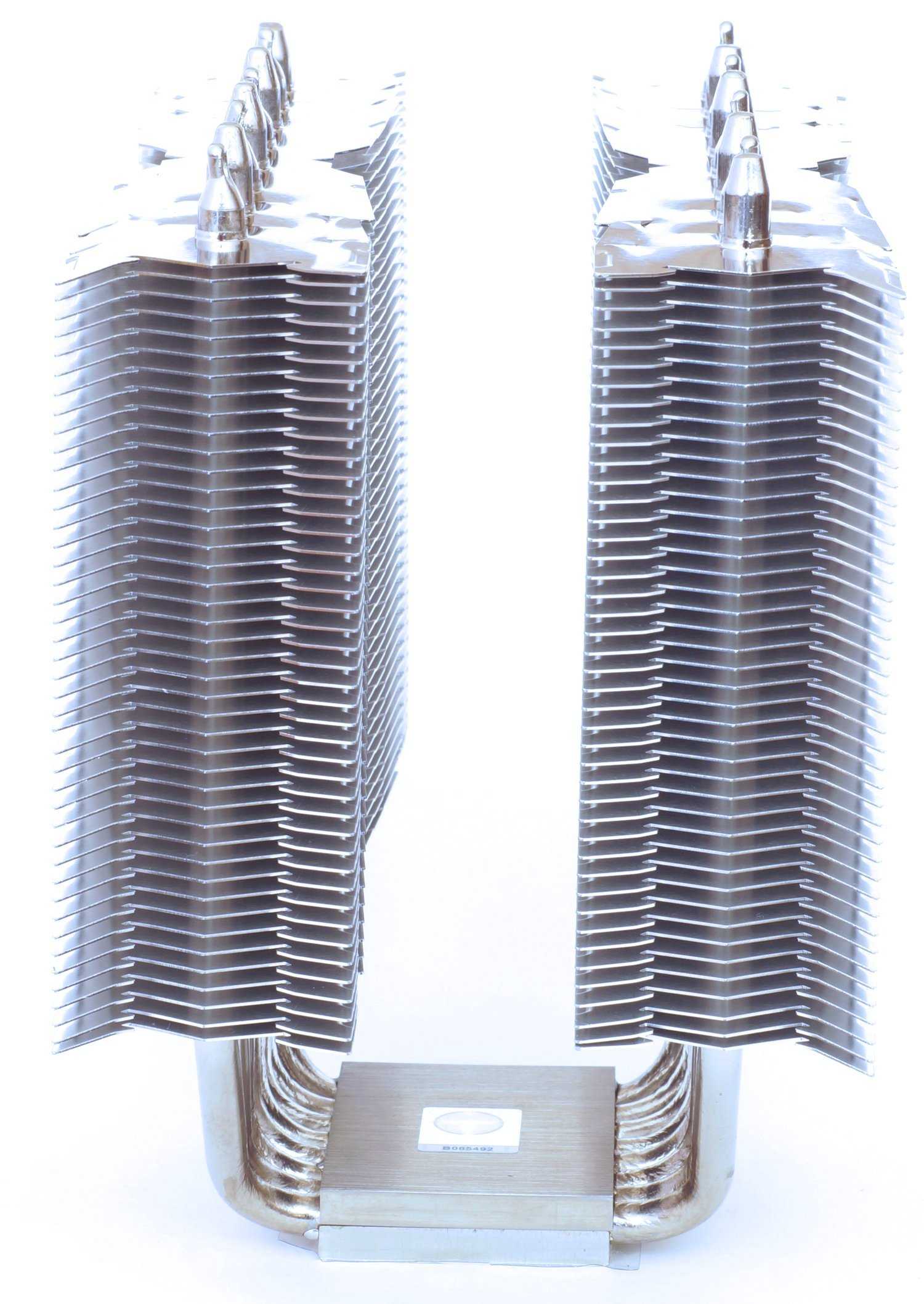 Каждая из секций содержит по 43 алюминиевые пластины с межреберным расстоянием 2 мм (стандартное решение, чтобы обеспечить высокую эффективность охлаждения даже при минимальных оборотах вентилятора). Радиатор имеет асимметричную форму, призванную улучшить совместимость с материнскими платами, где слот PCI-E x16 расположен на минимальном расстоянии от сокета (это может пригодиться владельцам материнских плат mATX). Что касается совместимости с высокой памятью, то это достигнуто за счет использования одного вентилятора, размещаемого между двумя секциями.