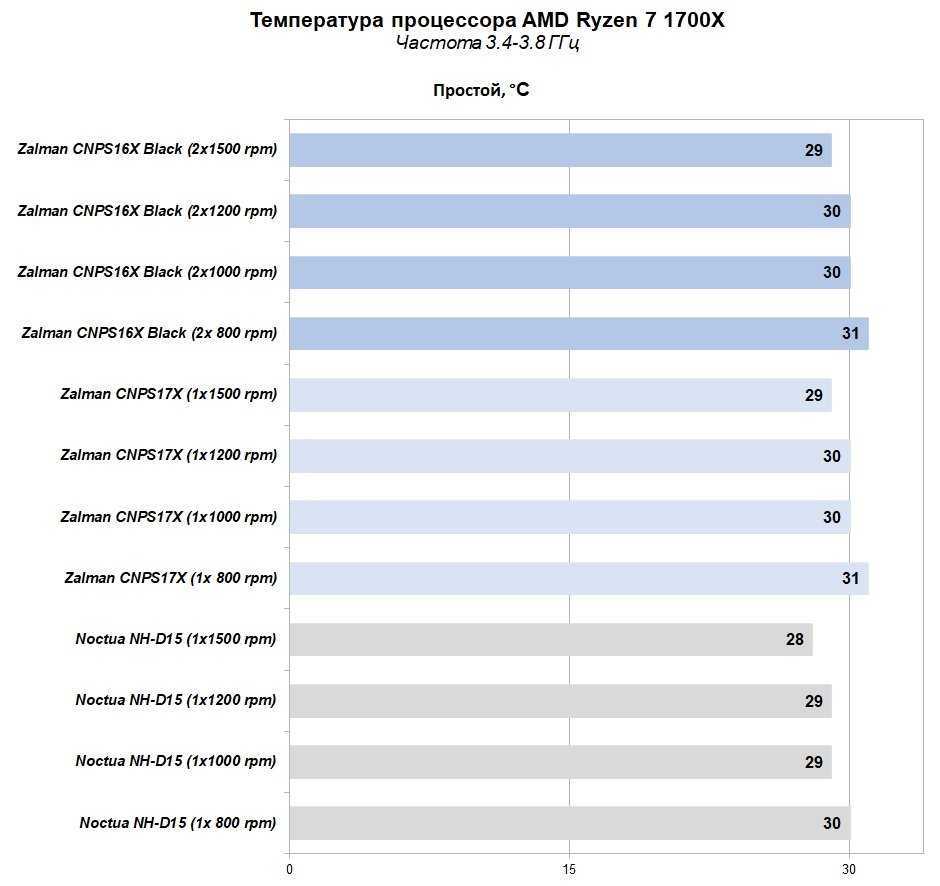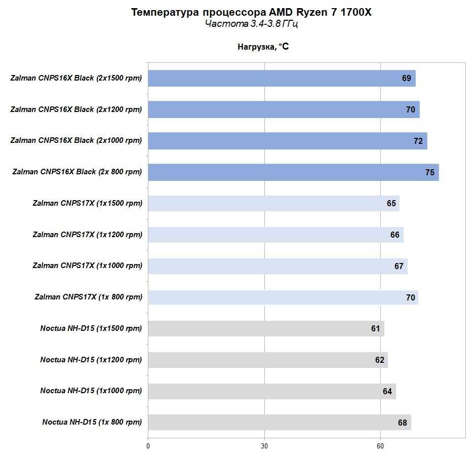 Ожидаемо, что оба рассматриваемых кулера Zalman уступили двухсекционному Noctua NH-D15 (а значит, и Zalman CNPS20X), но всё же результаты получились неплохие! Так, Zalman CNPS17X проигрывает эталонному Noctua не больше 4 °С. В свою очередь Zalman CNPS16X Black уступает CNPS17X не больше 5 °С, но тут частично повлияла на результат не самая лучшая обработка основания (наличие вогнутости), что характерно для кулеров с технологией прямого контакта.